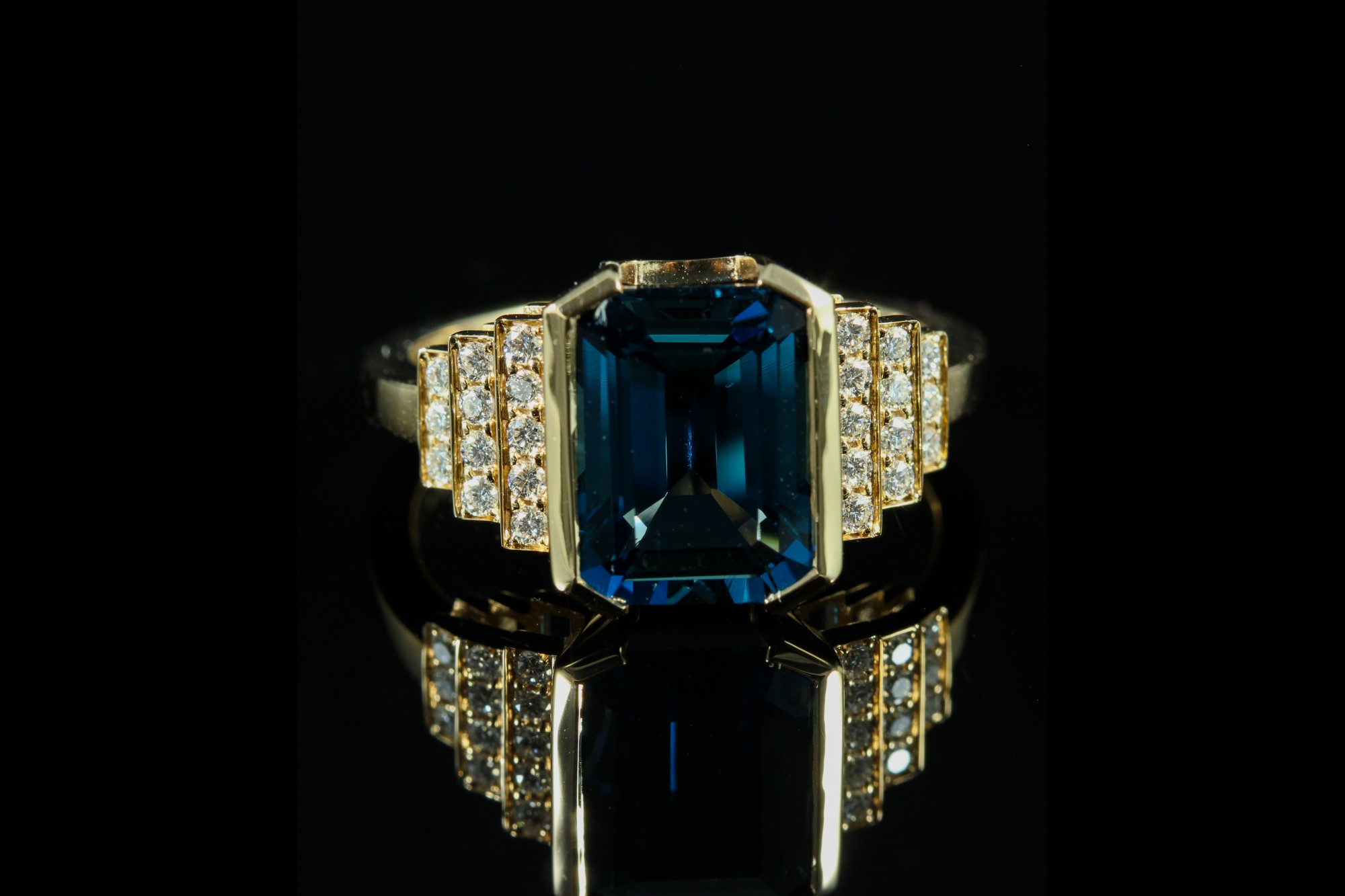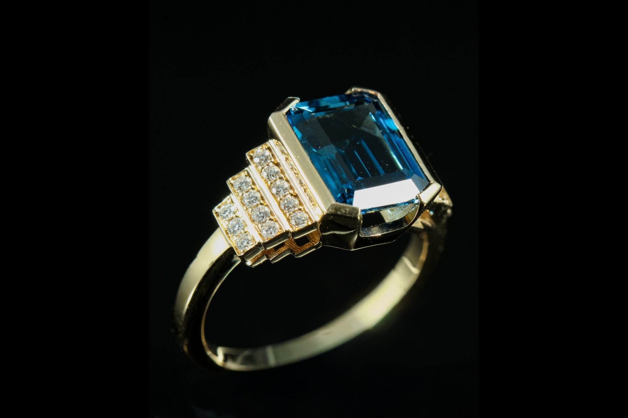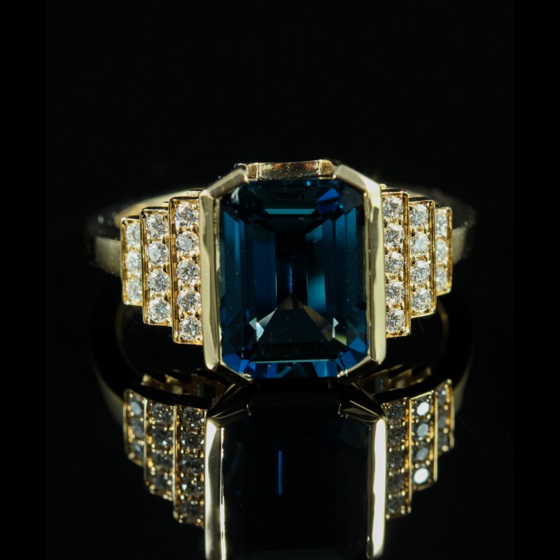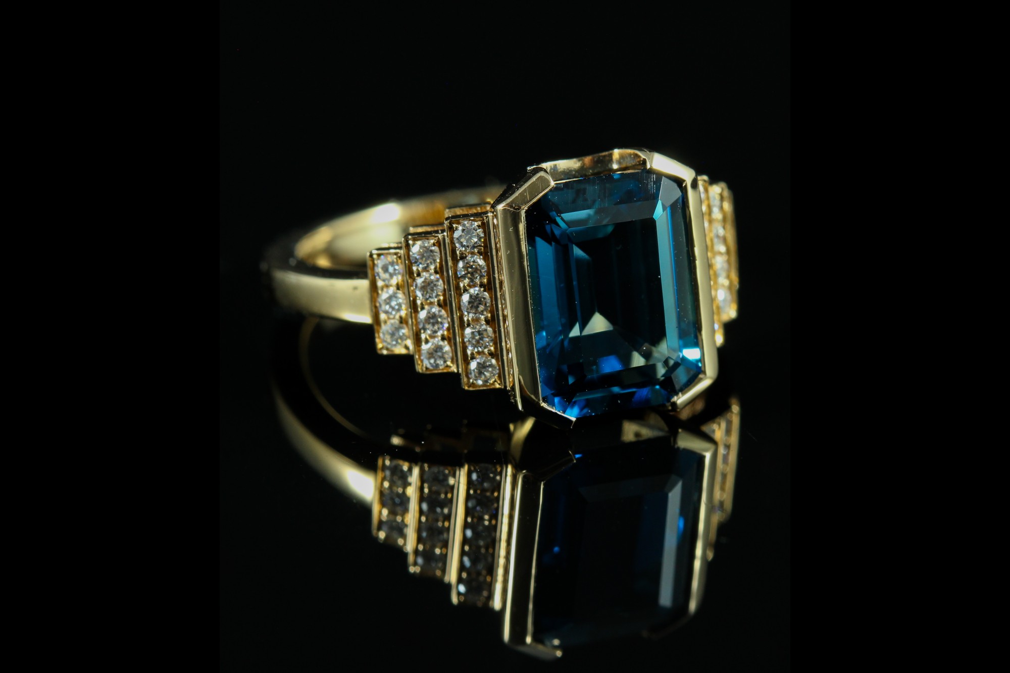 Bague en or rose sertie d’une topaze Blue London de 3,86 ct, entourée de diamants totalisant 0,22 ct, pour un éclat raffiné et sophistiqué.