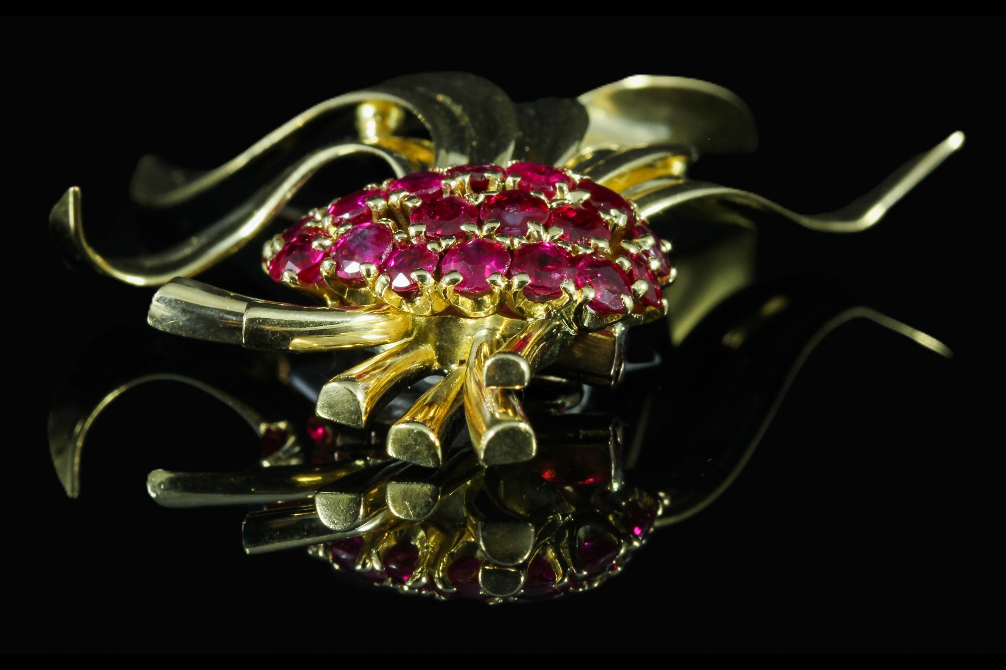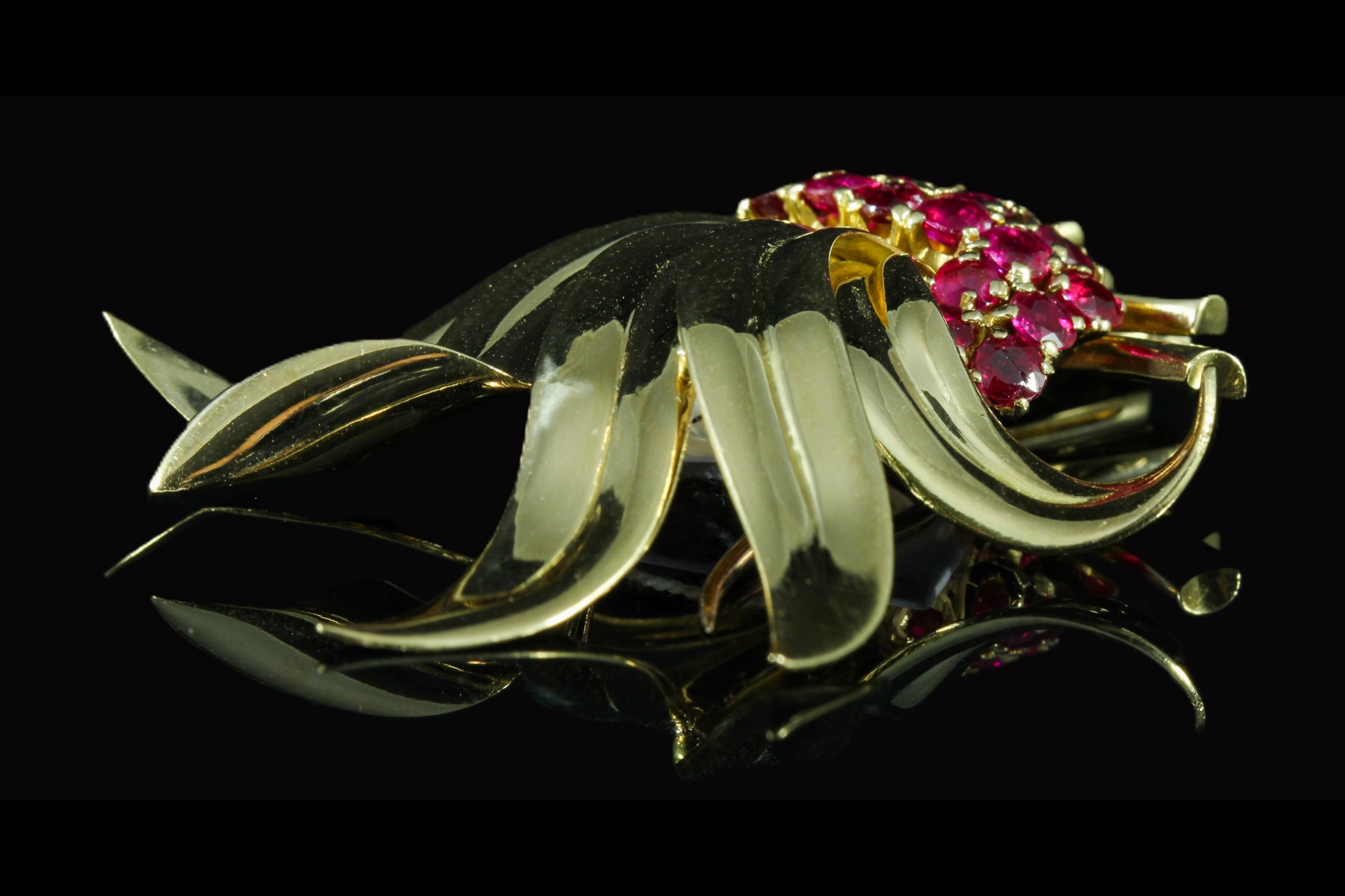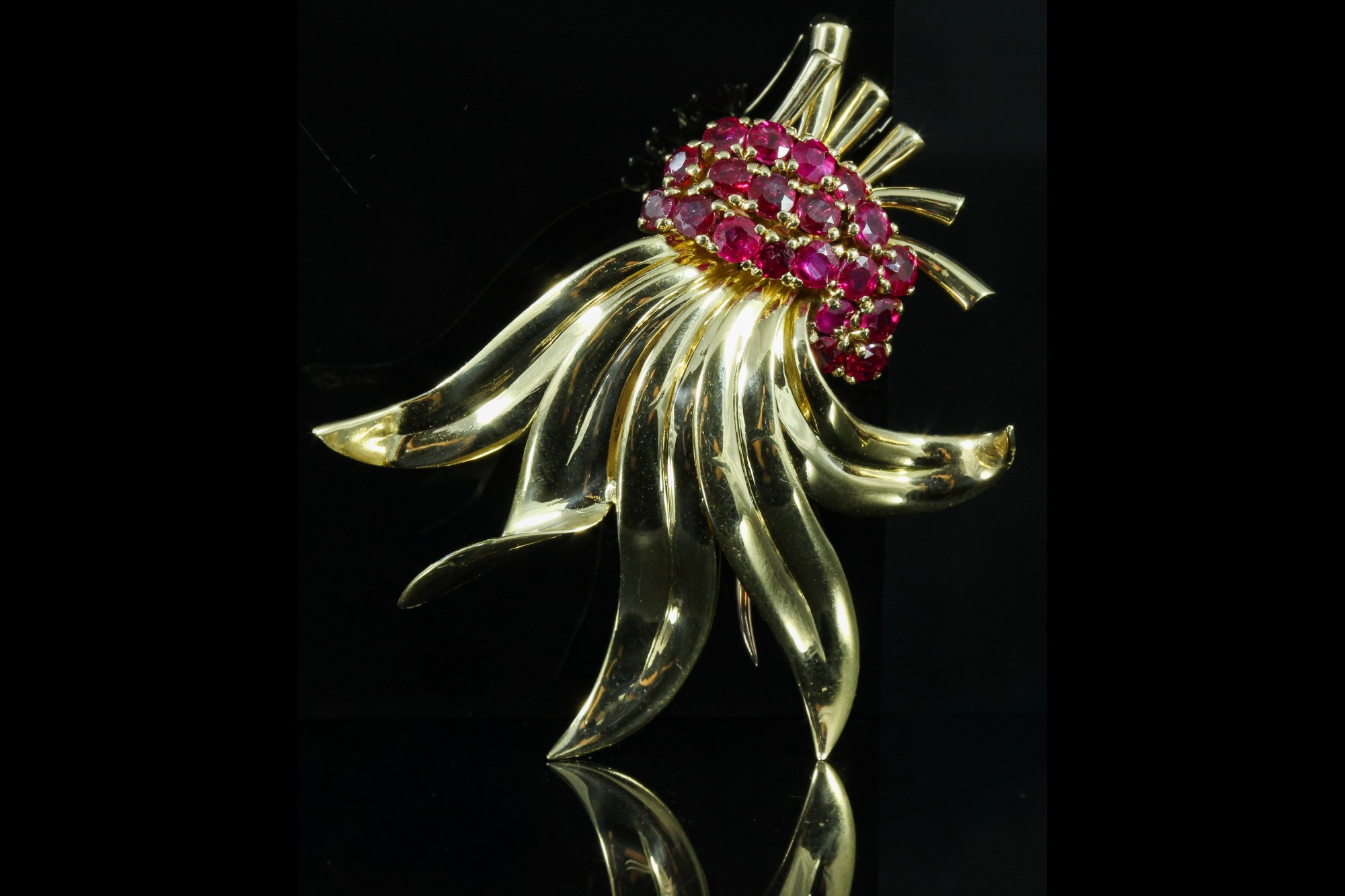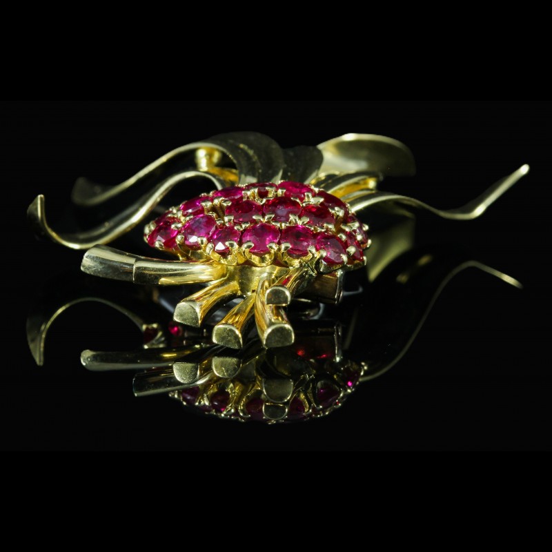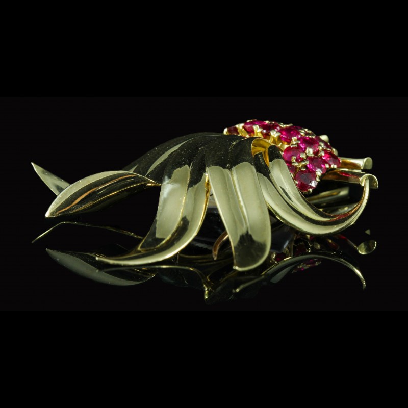 Broche gerbe or jaune sertie de rubis framboise