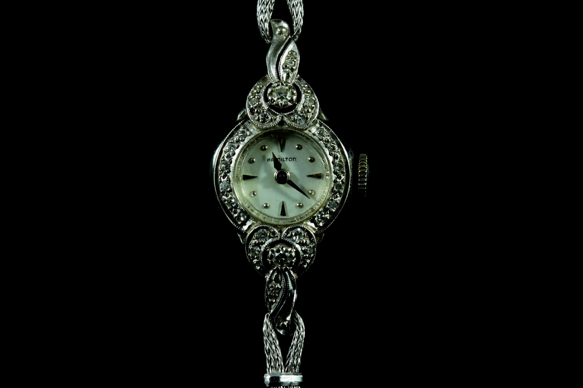 Cette montre-bracelet Hamilton de 7,45 g présente un serti central de diamants totalisant 2,50 carats, accompagné d’un entourage de 0,70 carat pour un éclat exceptionnel.