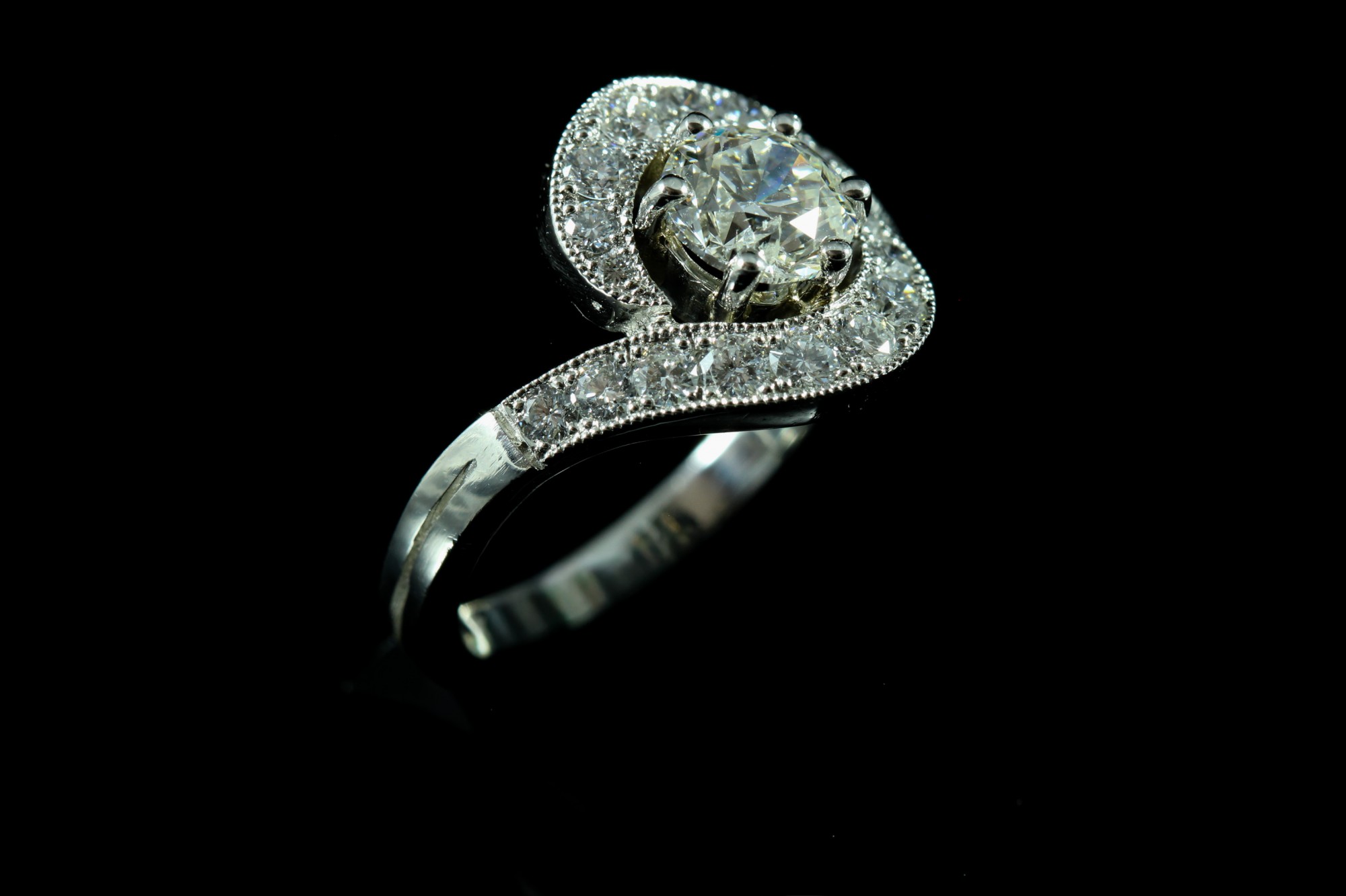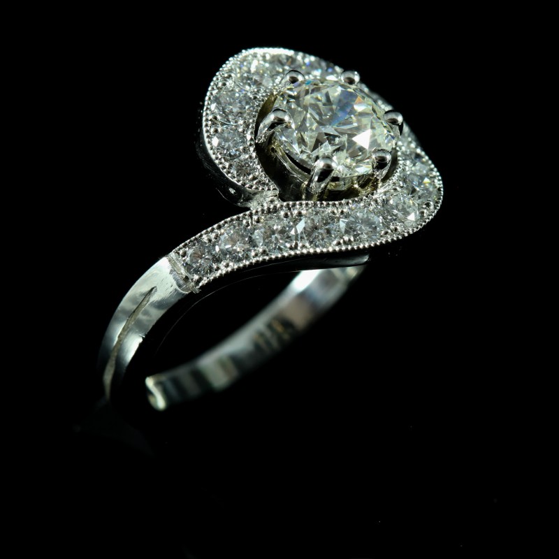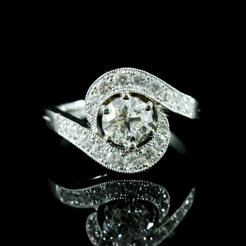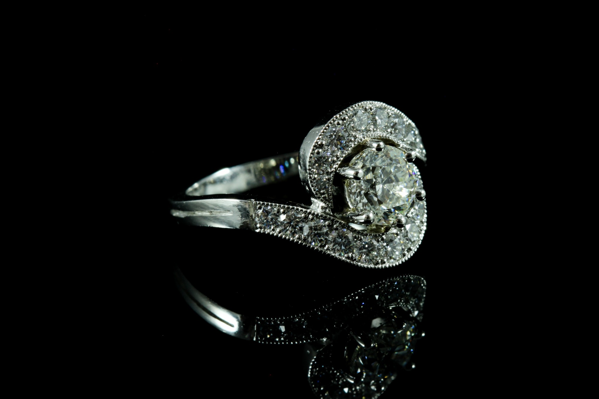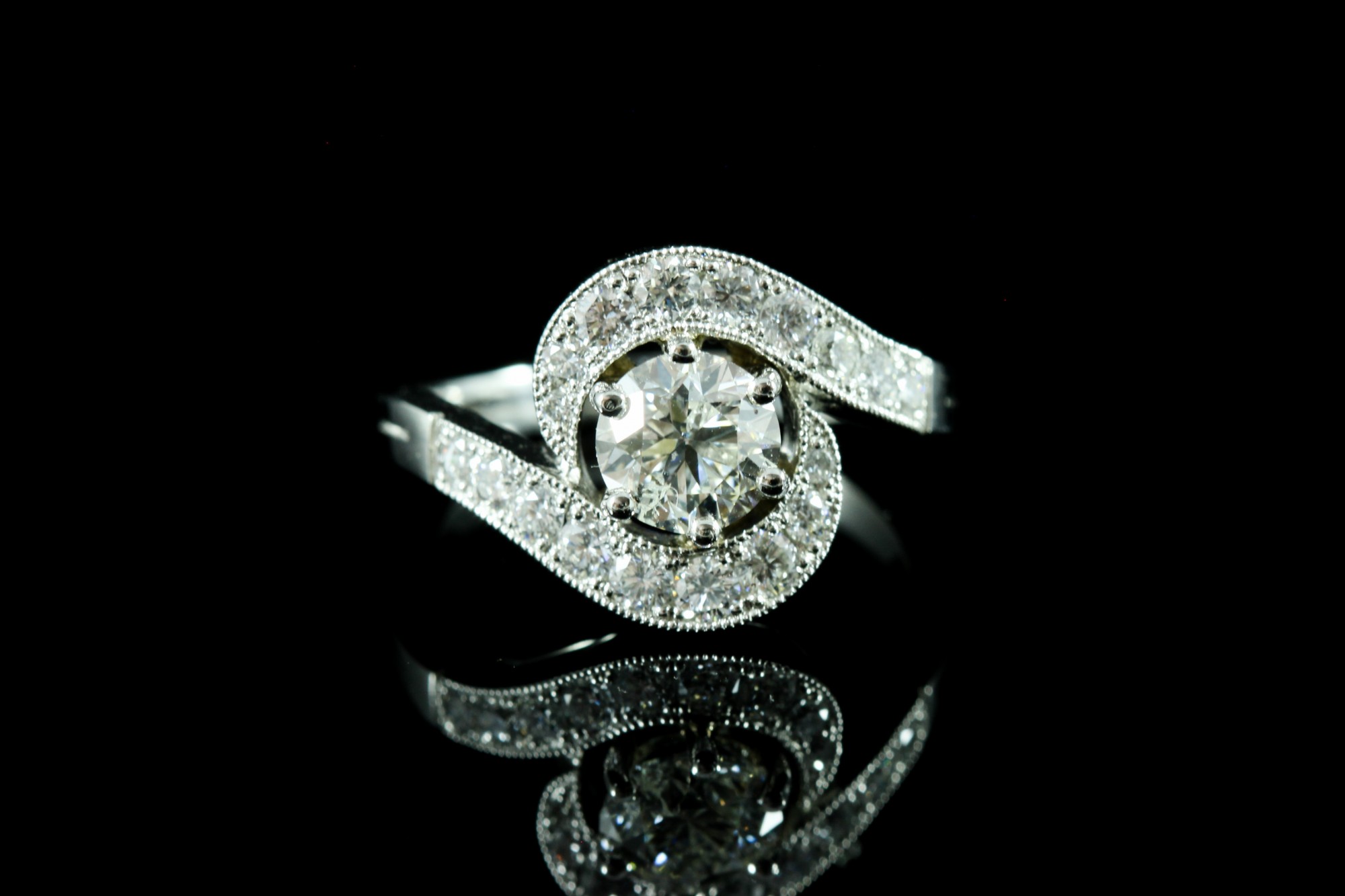 Cette bague met en valeur un diamant central de 1 carat, entouré de diamants totalisant 0,68 carat, pour un poids total de 6,7 g
