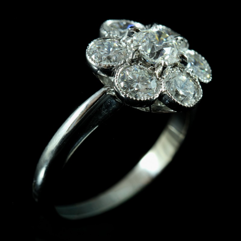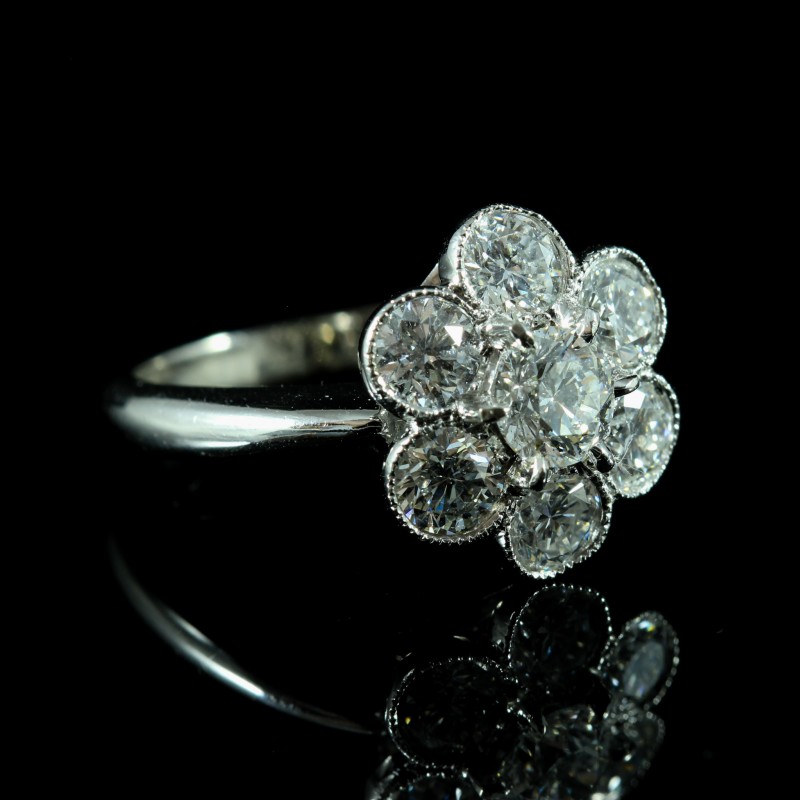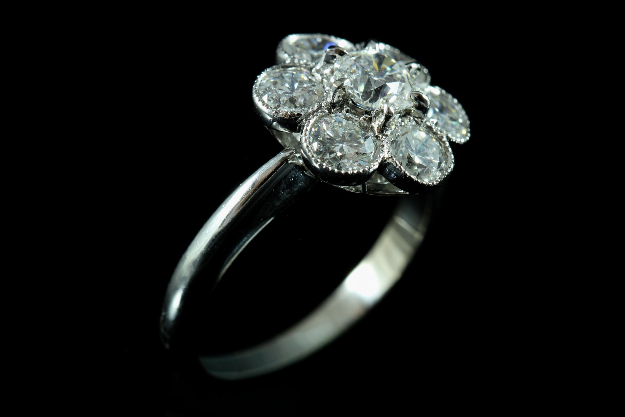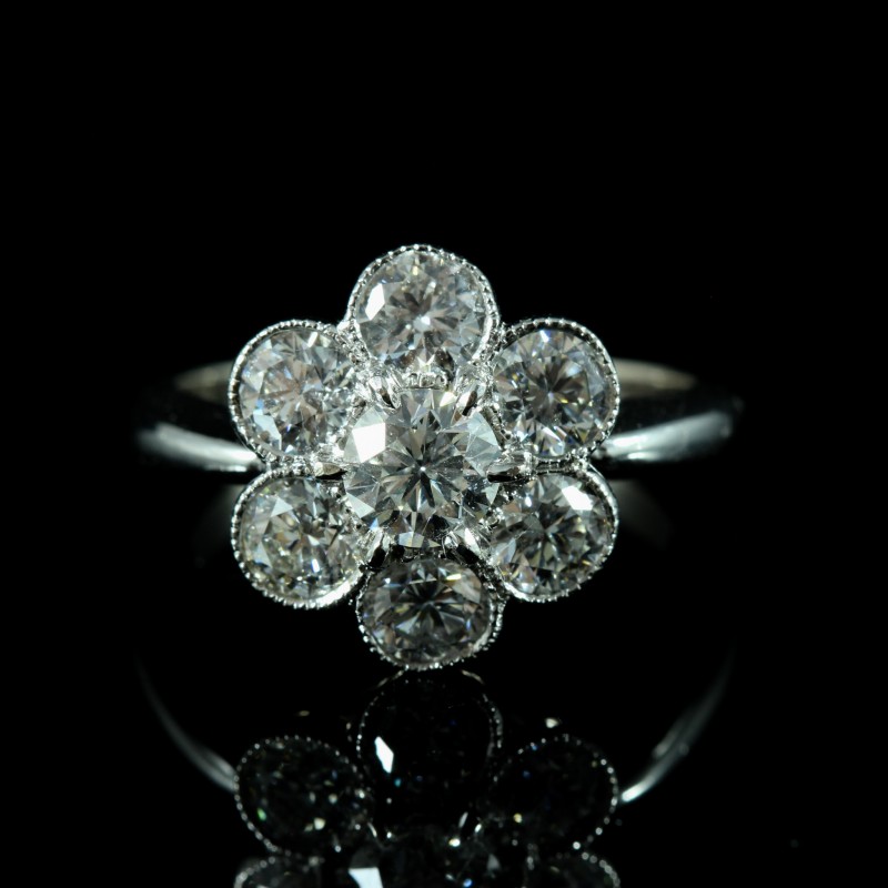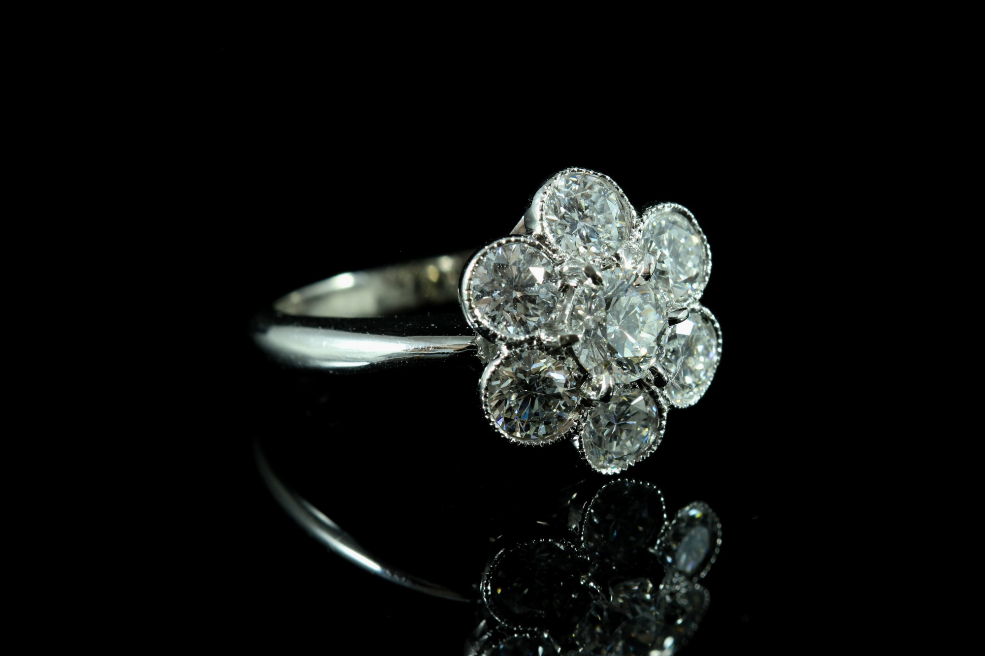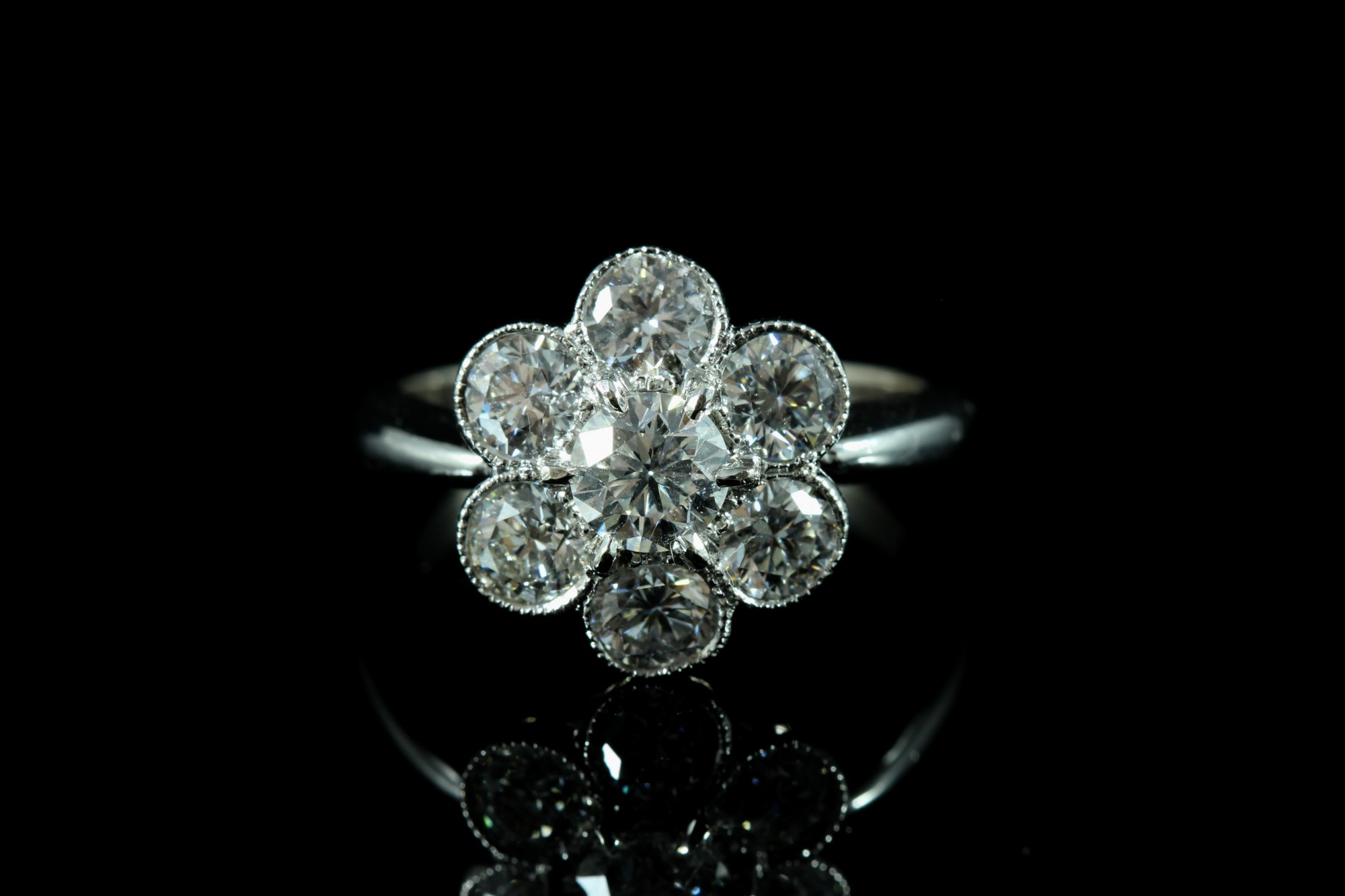 Cette bague met en valeur un diamant central de 0,60 carat, entouré de diamants totalisant 2,45 carats, pour un poids total de 5,9 g.