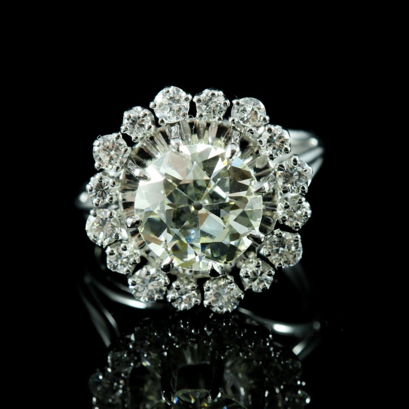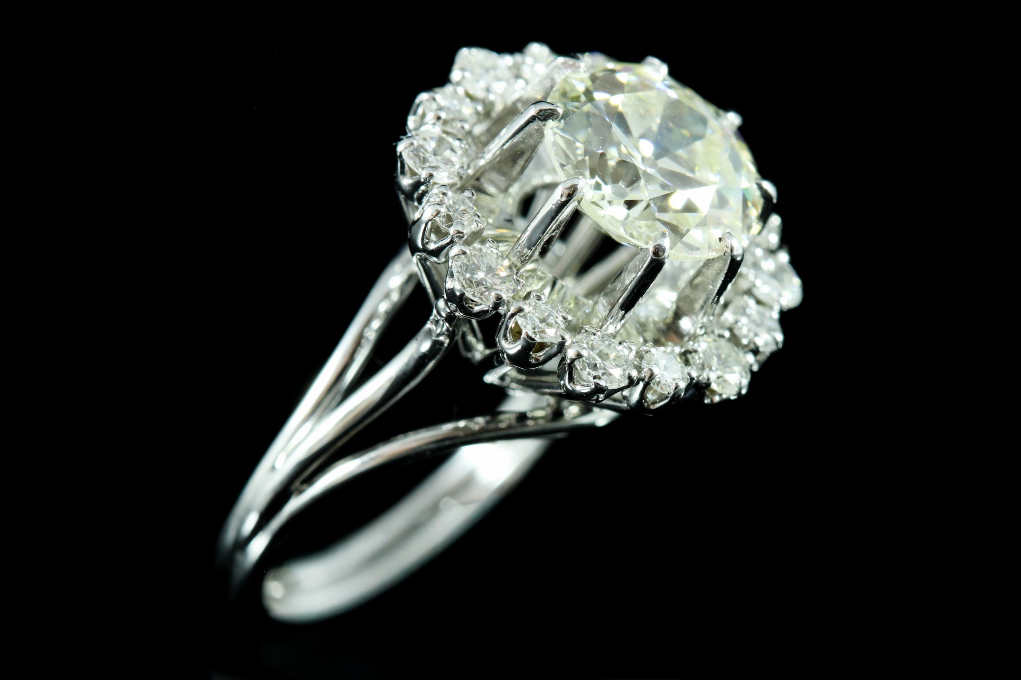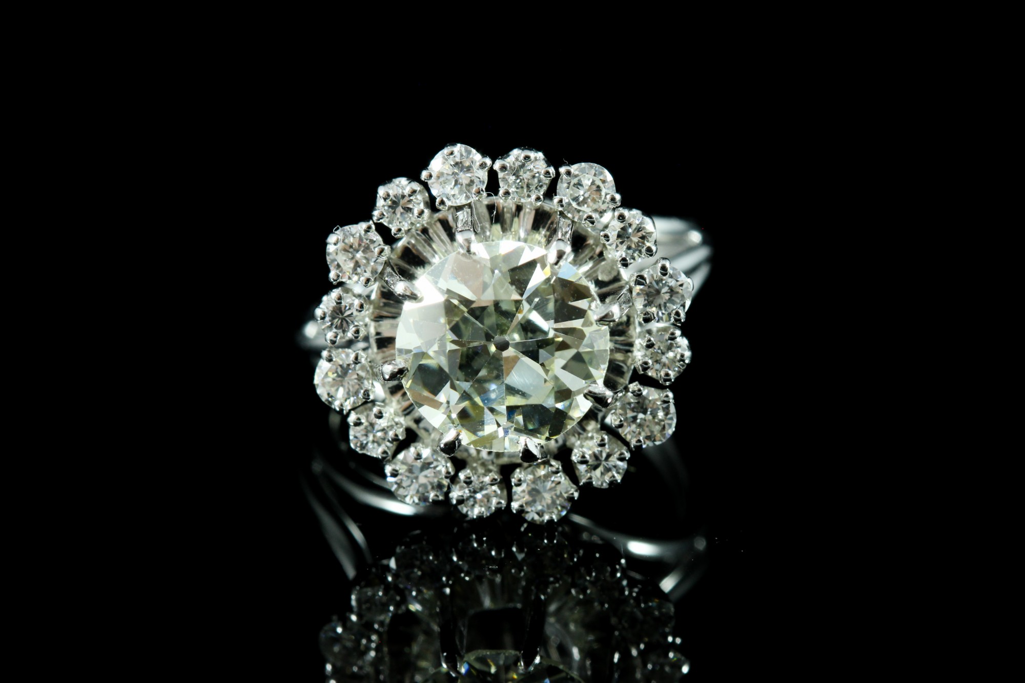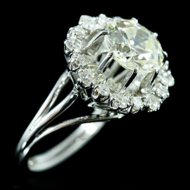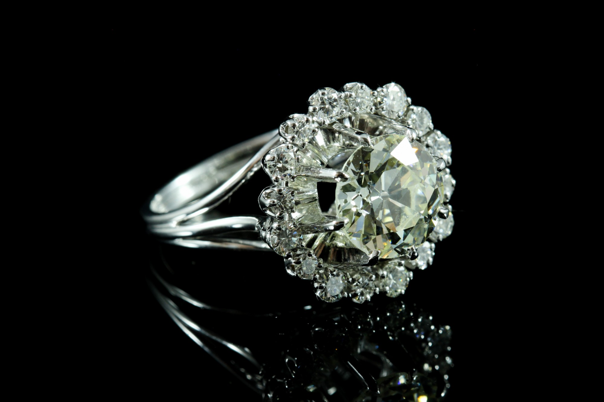 Cette bague met en valeur un diamant central de 2,50 carats, entouré de diamants totalisant 0,70 carat, pour un poids total de 7,45 g.