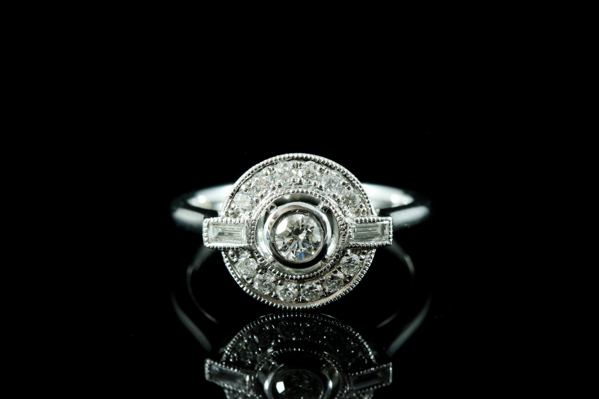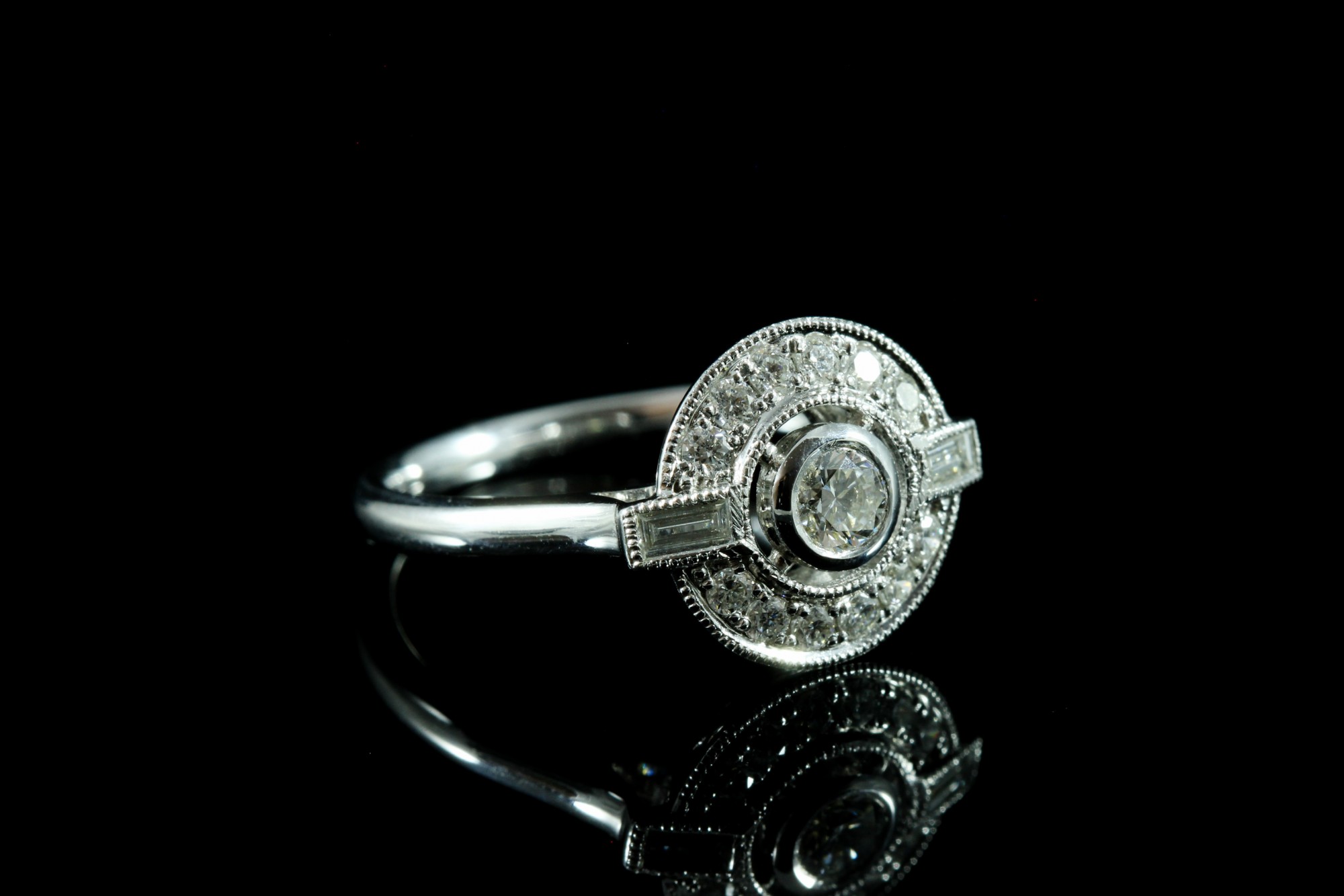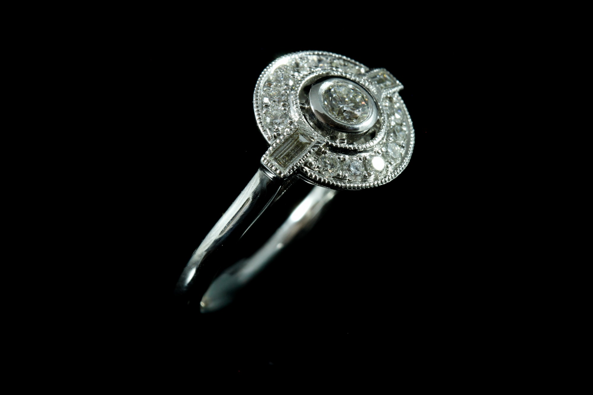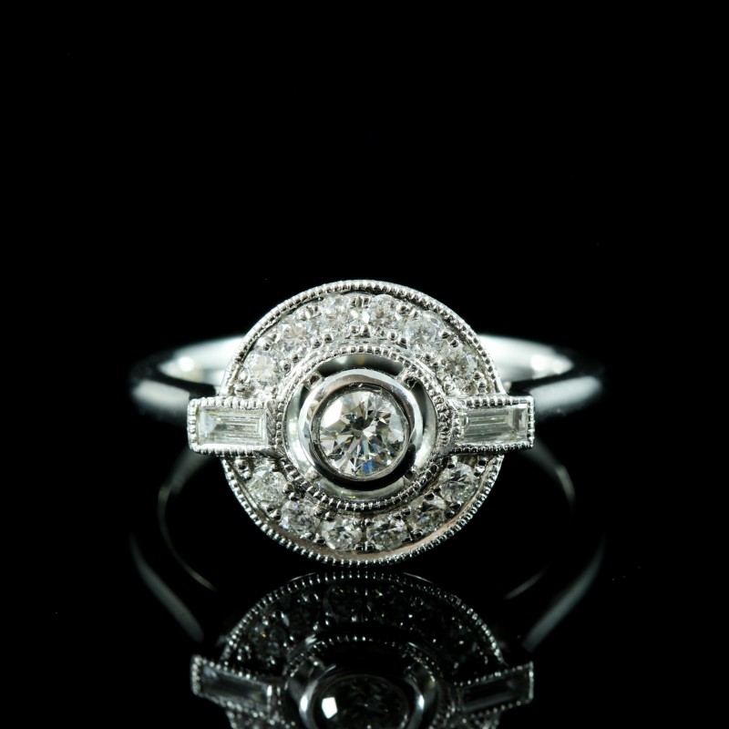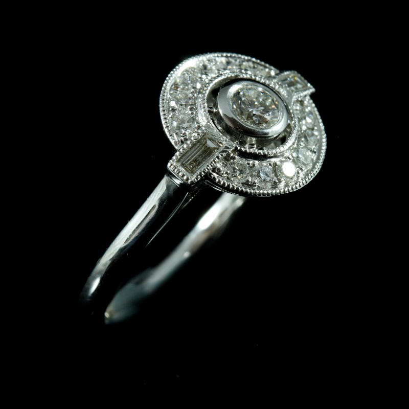 Cette bague met en valeur un diamant central de 0,19 carat, couleur FG, pureté SI, entouré de diamants totalisant 0,33 carat.