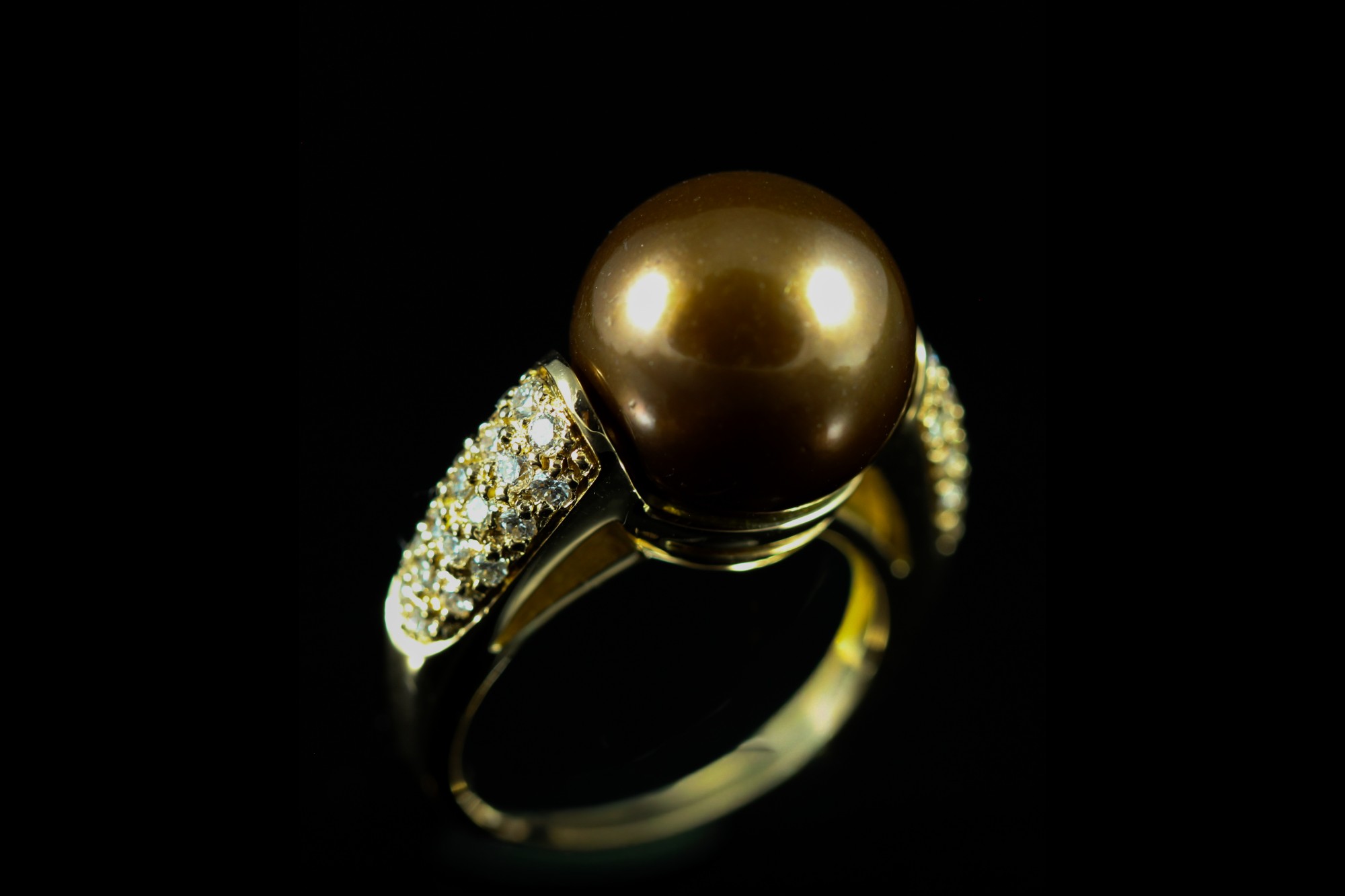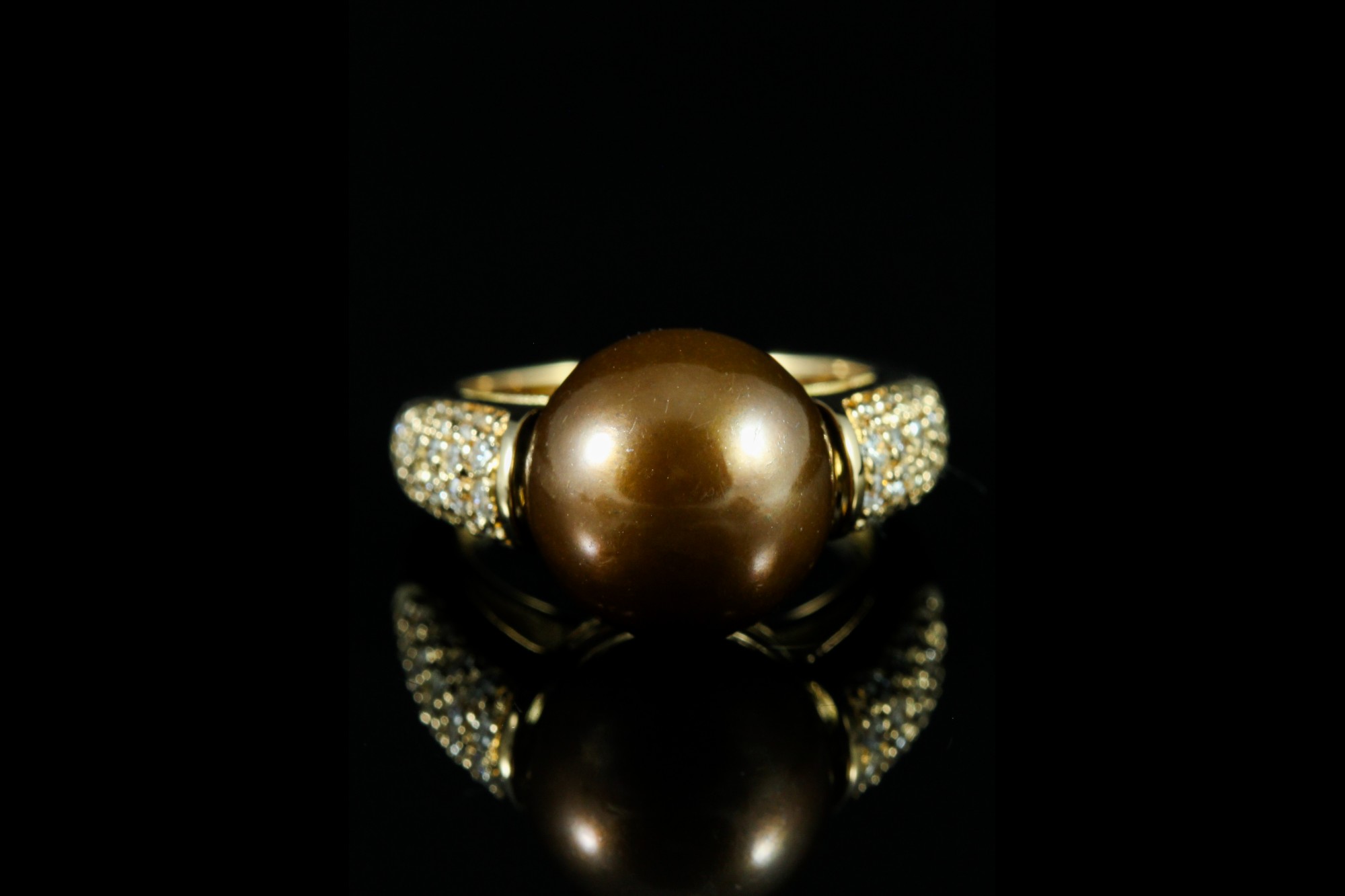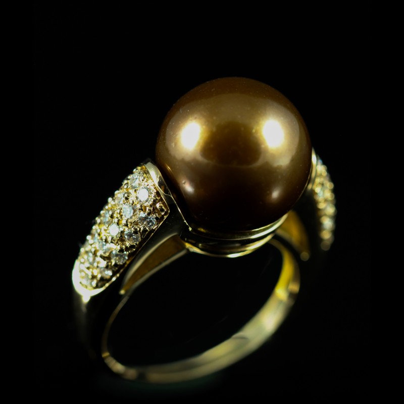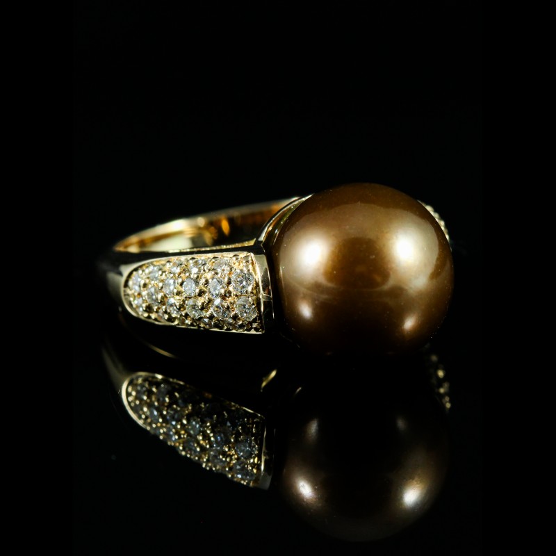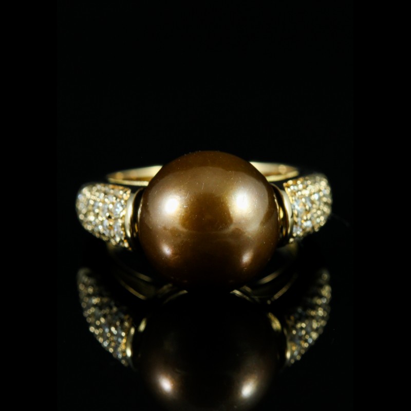 Bague en or rose sublimée par une perle chocolat aux reflets profonds, soulignée d’un entourage de diamants, taille 49, pour un poids total de 8,70 g