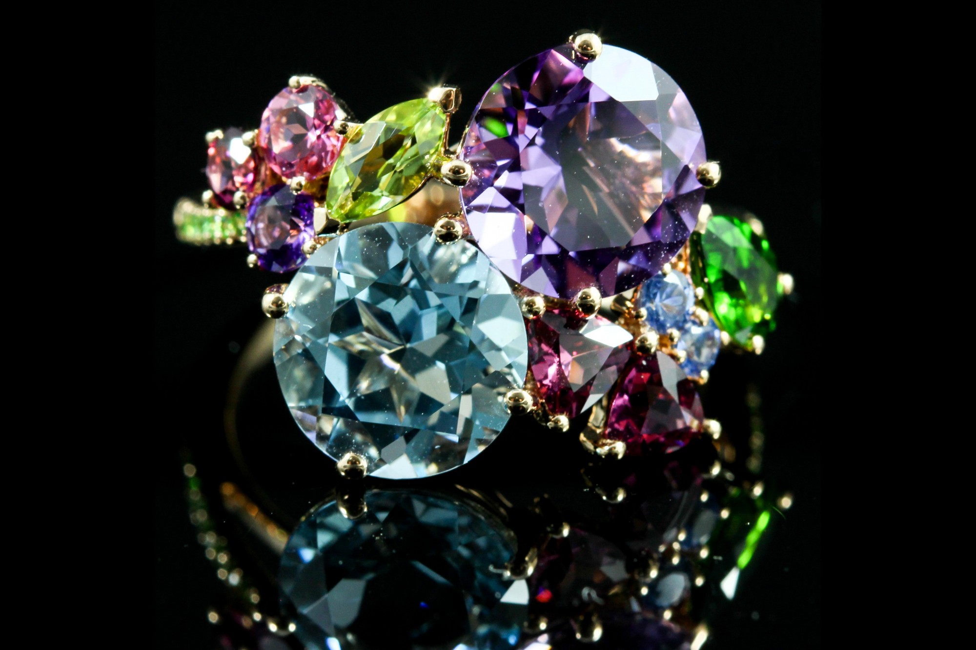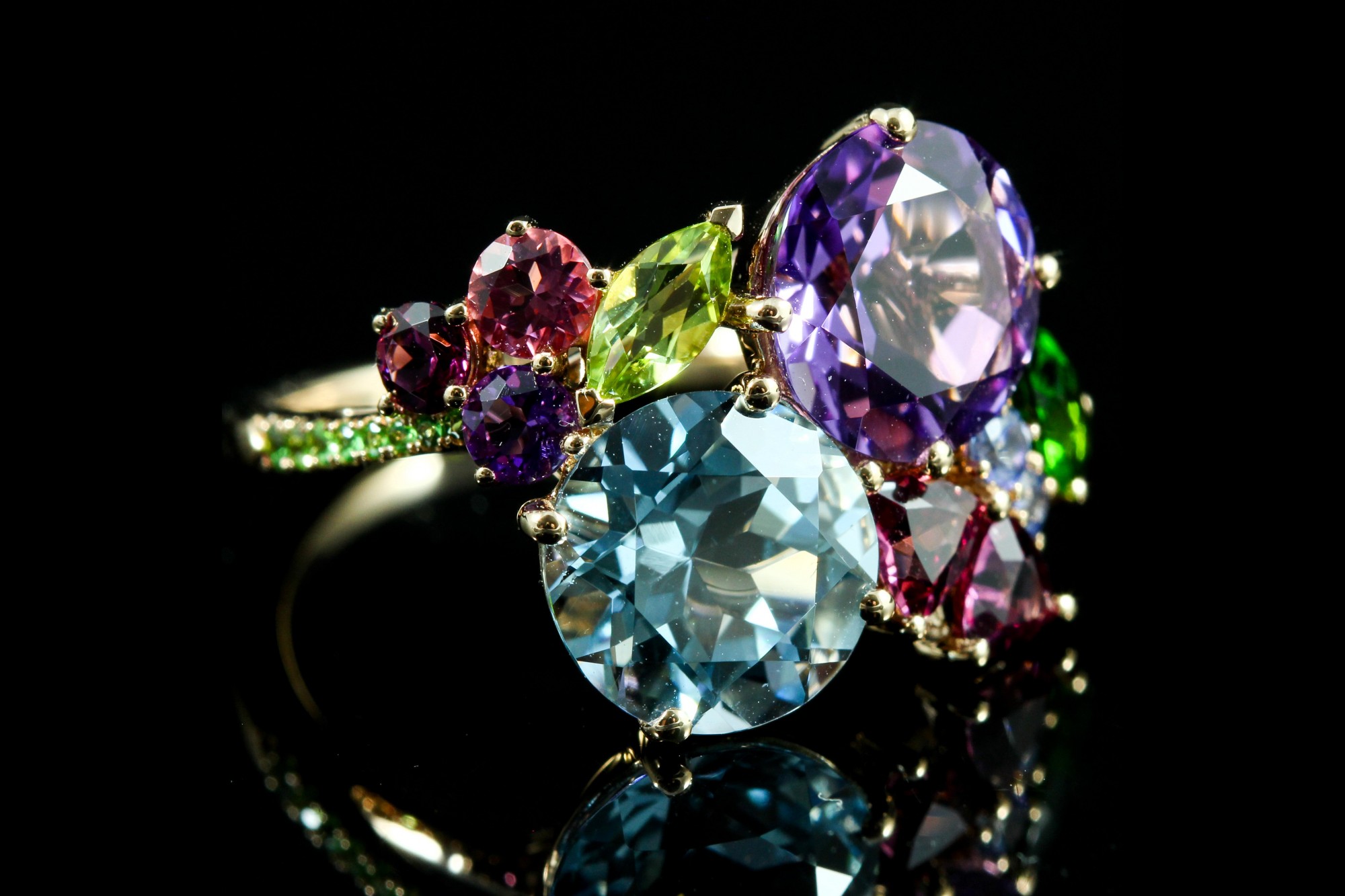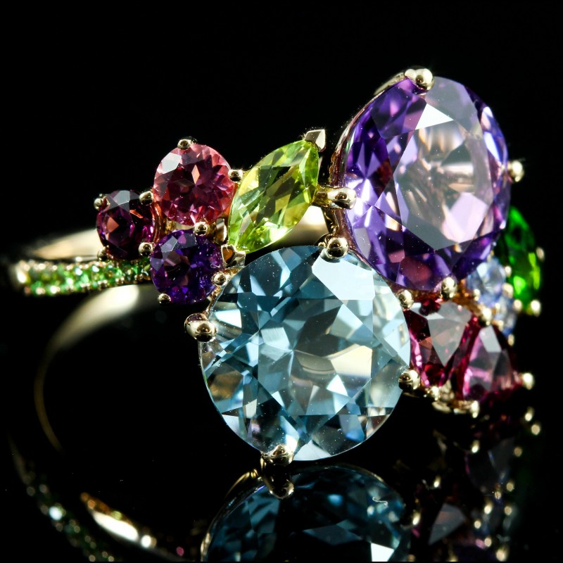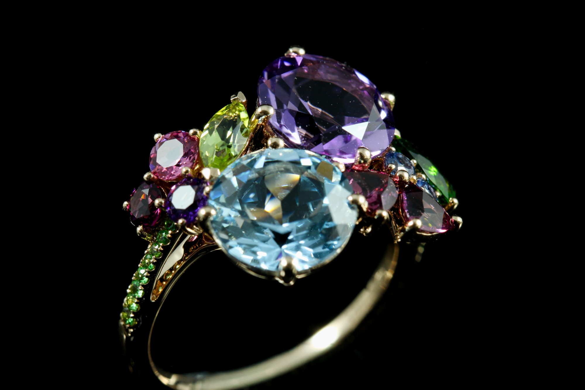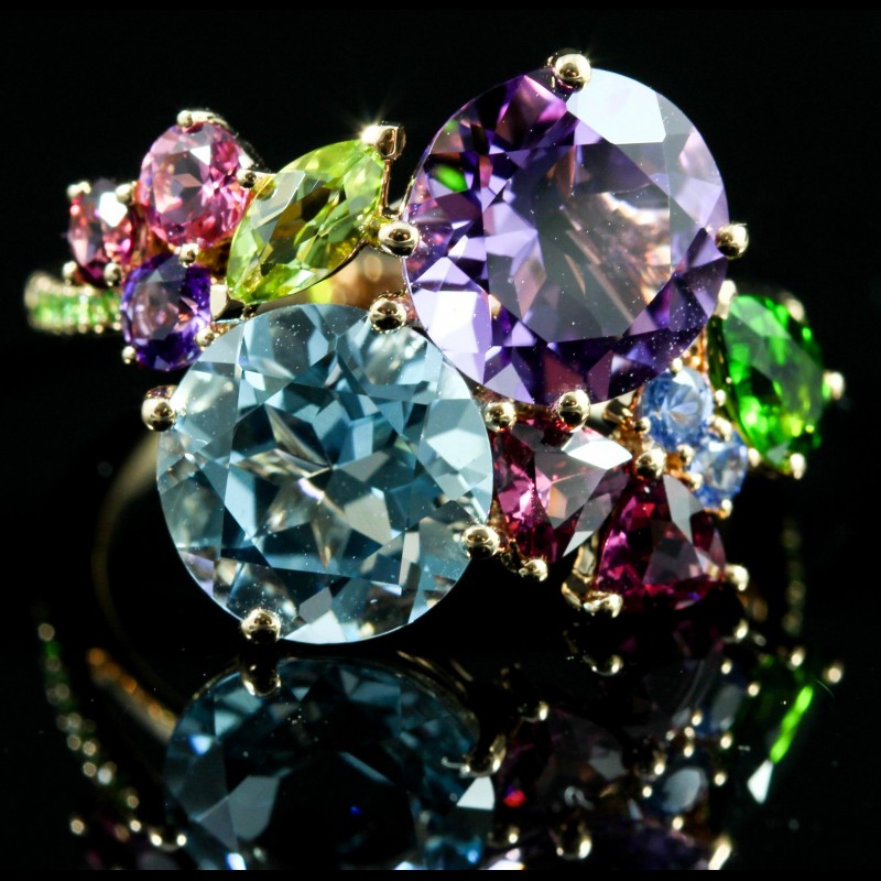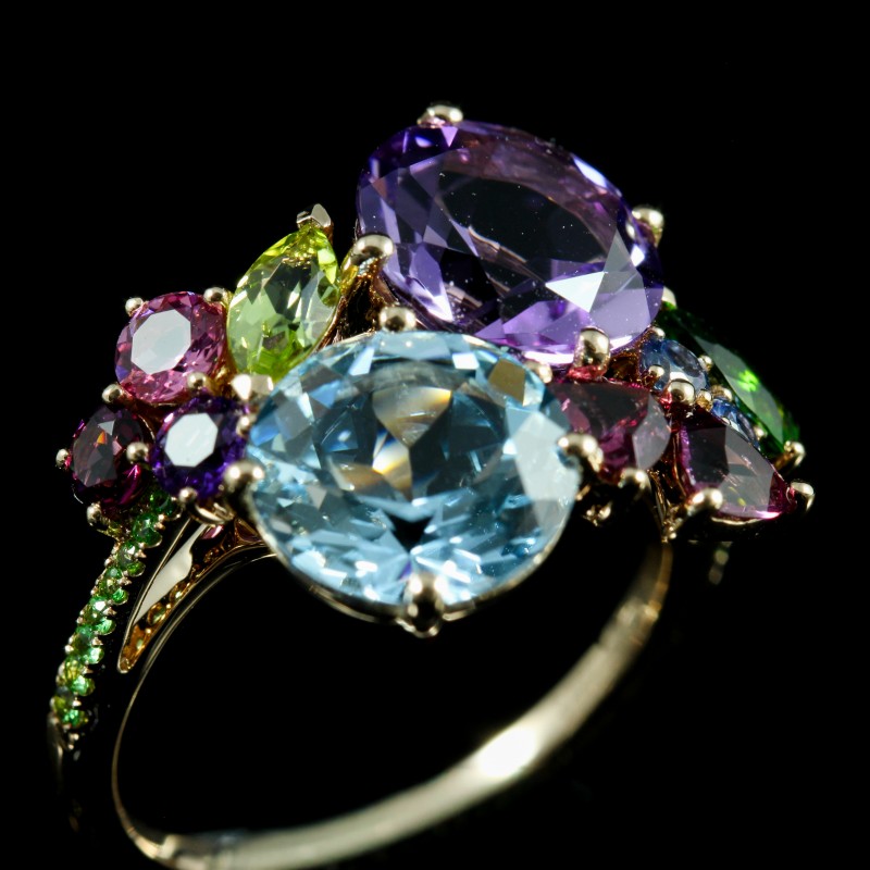 Bague Isabelle Langlois en or, composée d’améthyste, diopside, péridot, rhodolites et d’une topaze Blue London, pour un total de 6,27 ct, célébrant un éclat multicolore unique et raffiné.