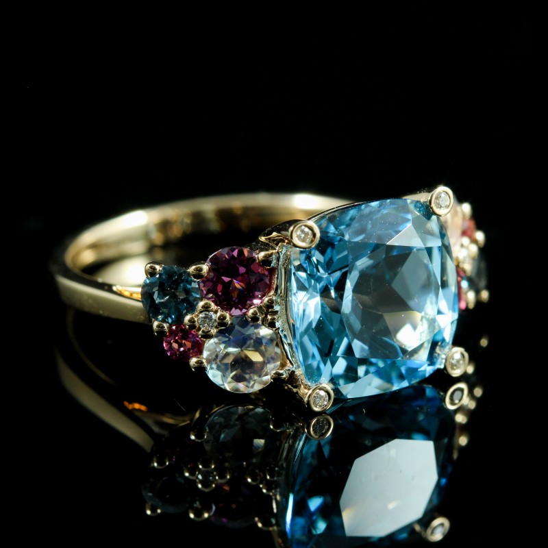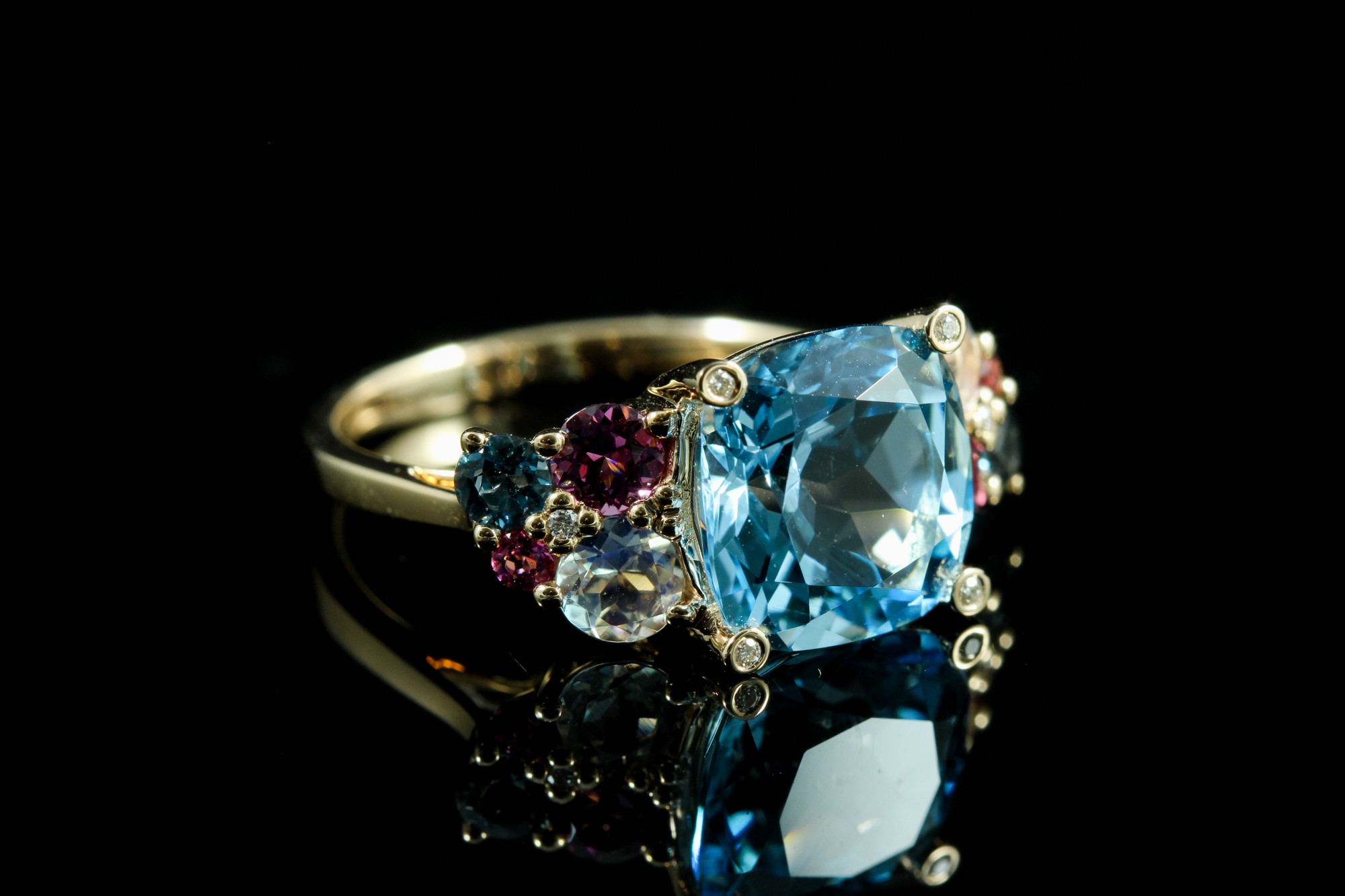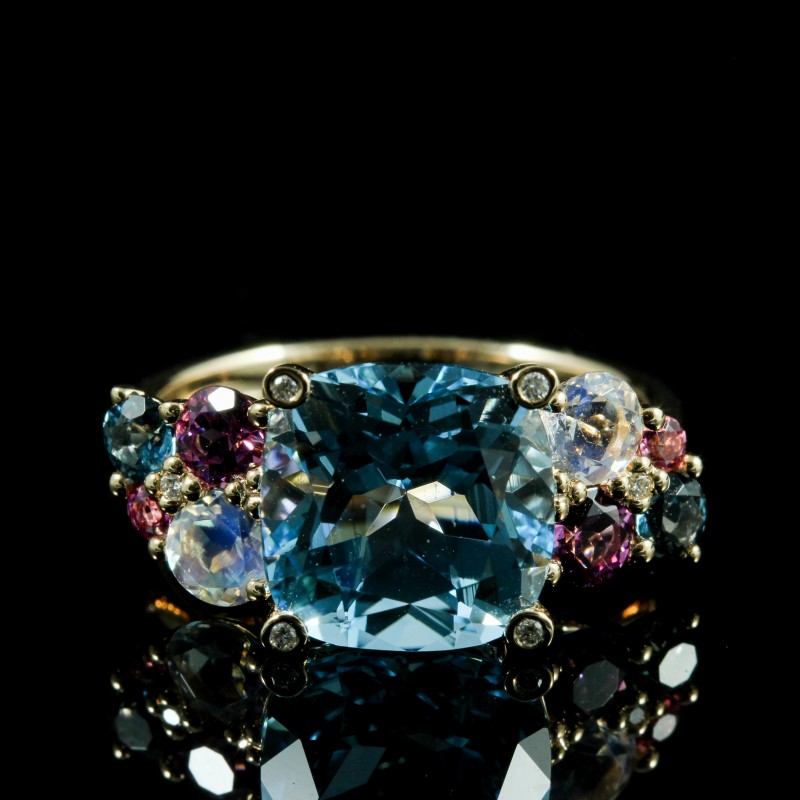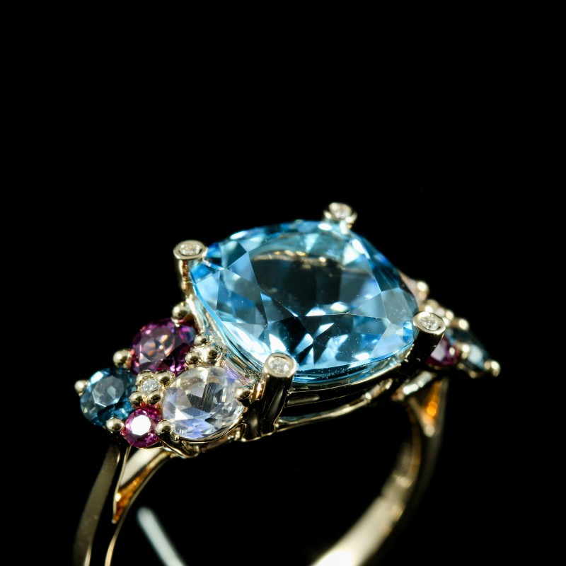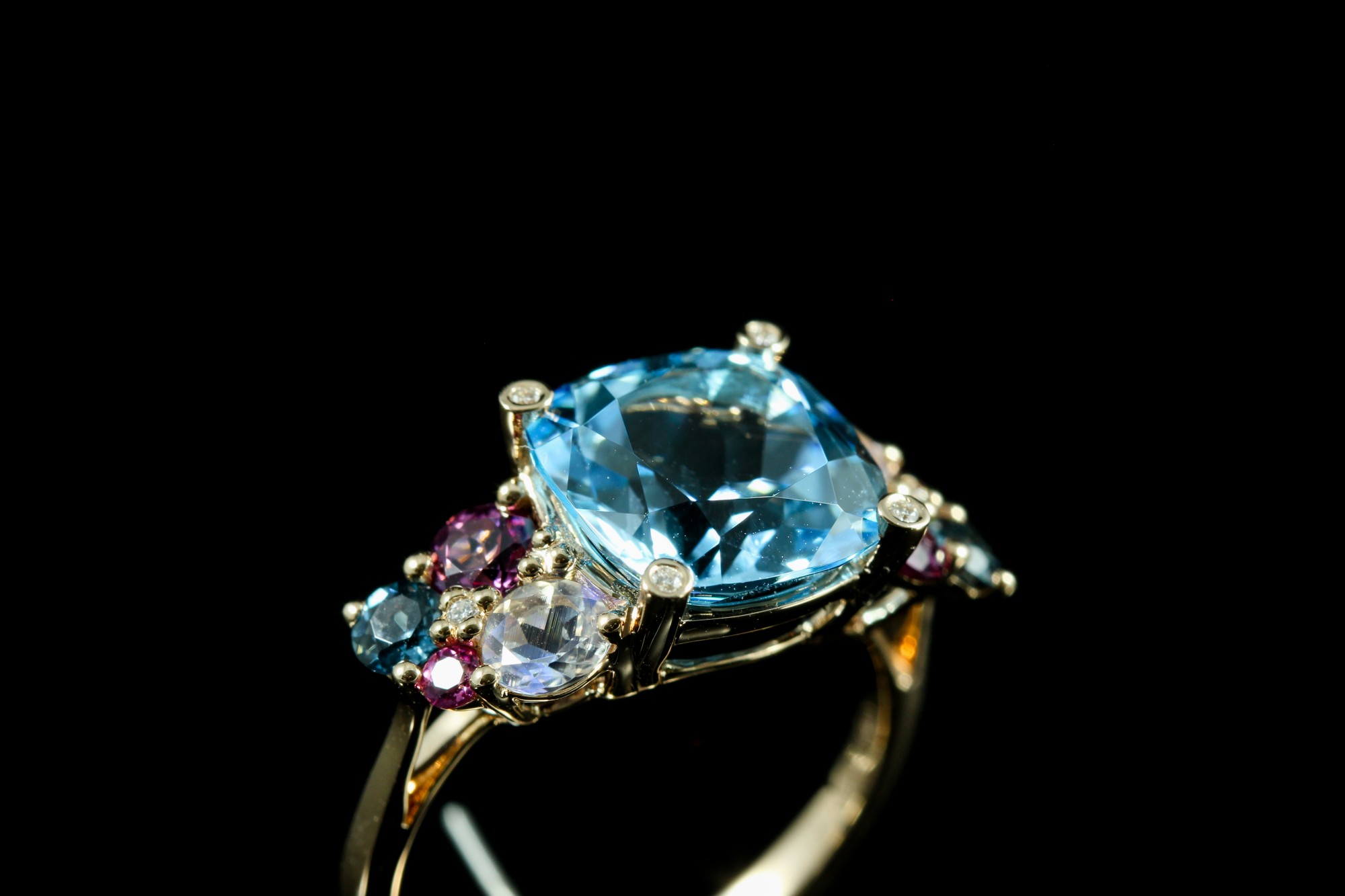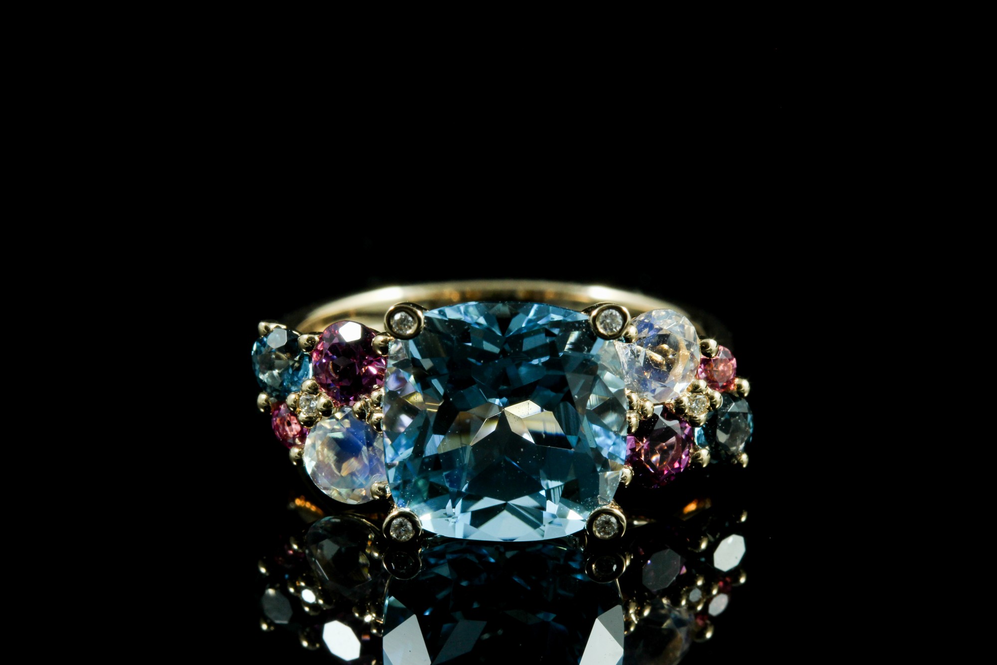 Bague Isabelle Langlois en or blanc , composée d'une topaze bleue en son centre , pierres de lune, rhodolites et diamants, pour un total de 5,93 ct, offrant un éclat multicolore unique et raffiné.
