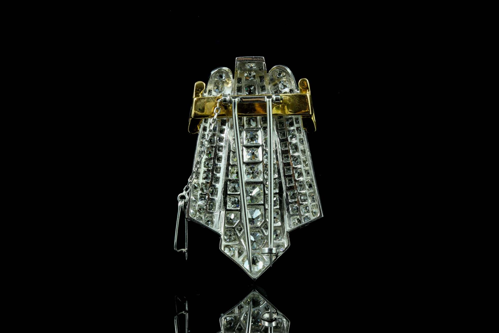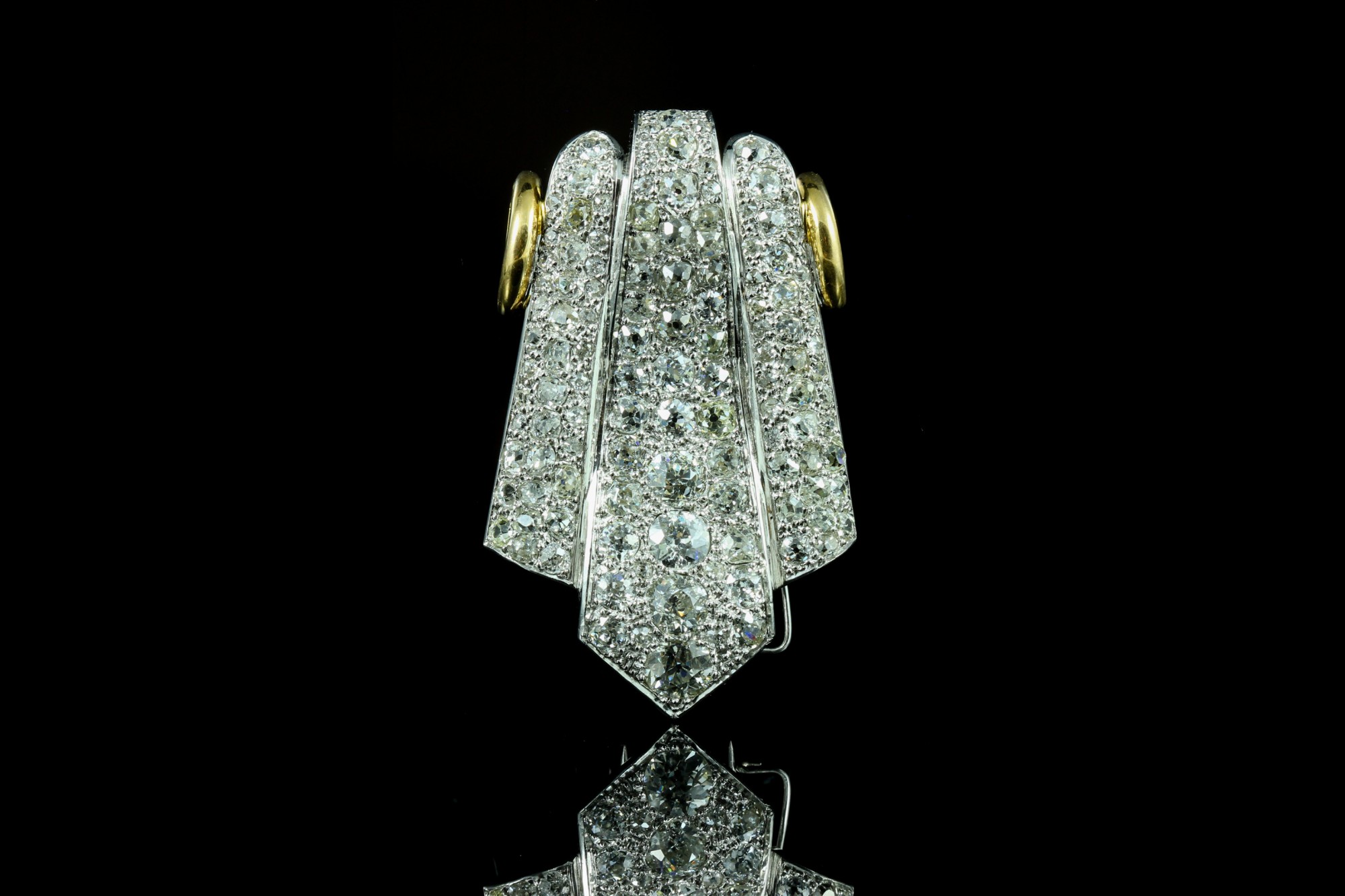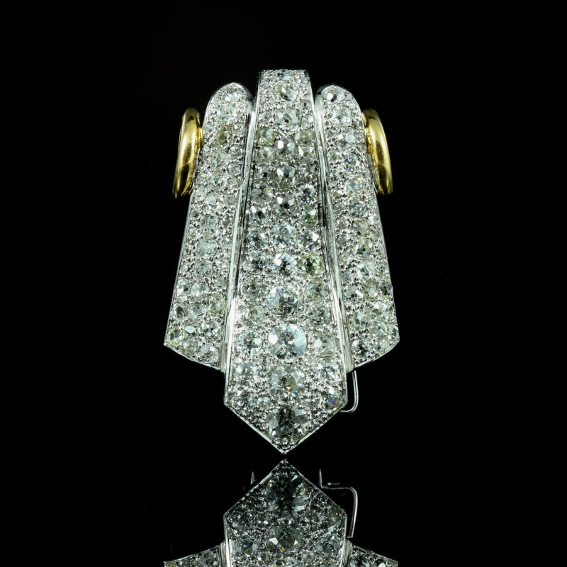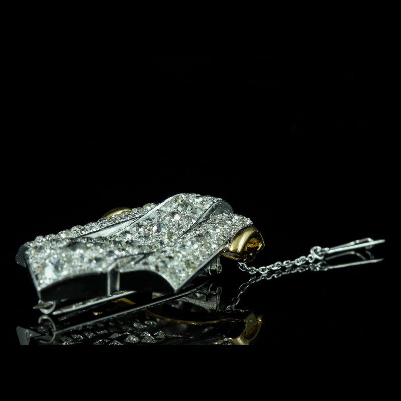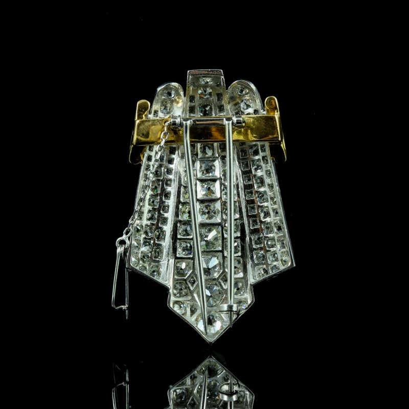 Cette broche en or jaune et platine se distingue par l’intensité de ses diamants (totalisant 5 carats environ), finement sertis pour créer un jeu de lumière captivant. Son esthétique affirmée, aux lignes structurées, évoque le savoir-faire joaillier traditionnel tout en conservant une présence moderne. Pièce singulière, elle s’impose avec élégance et rehausse instantanément une silhouette, de jour comme en soirée.