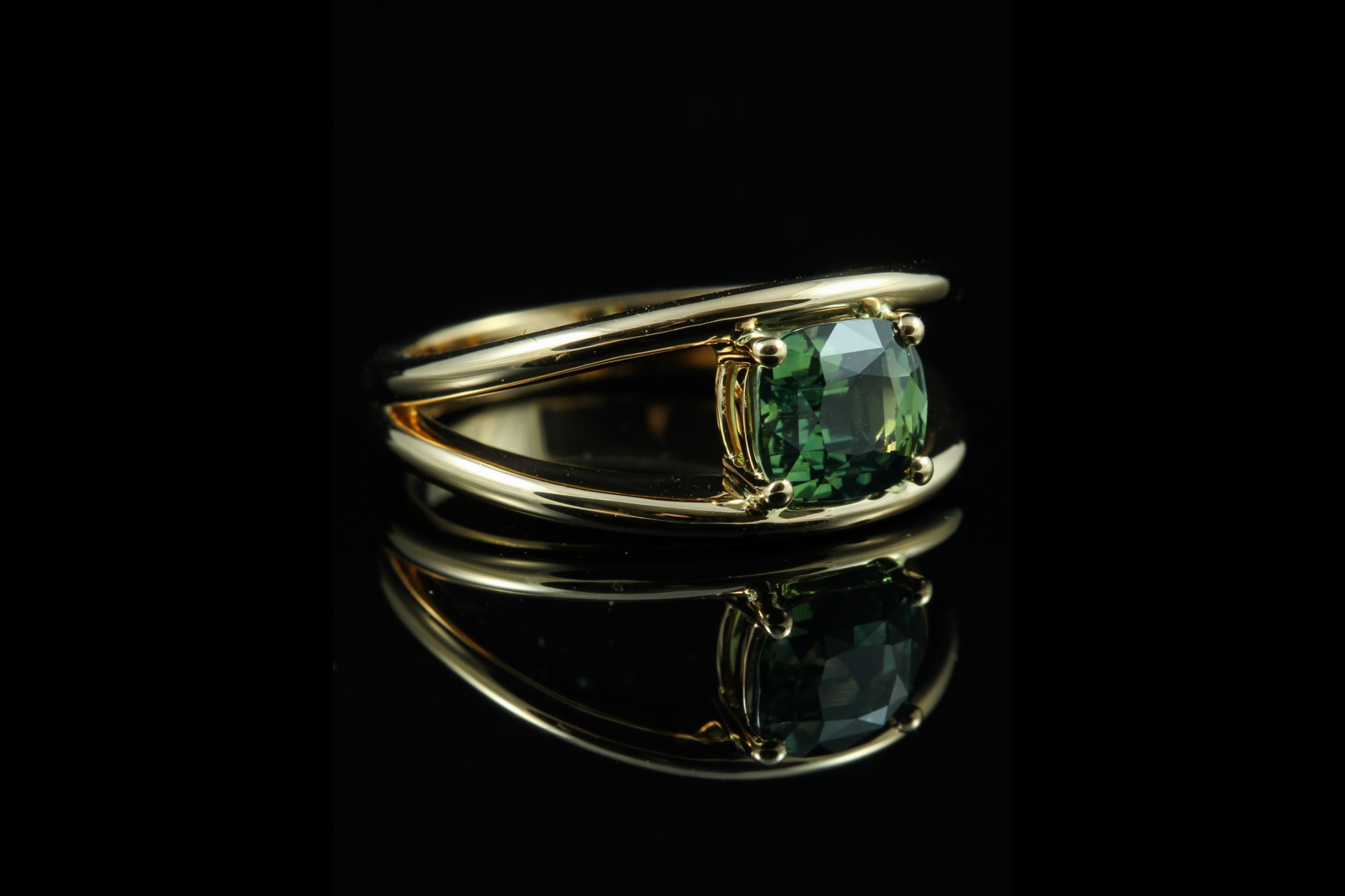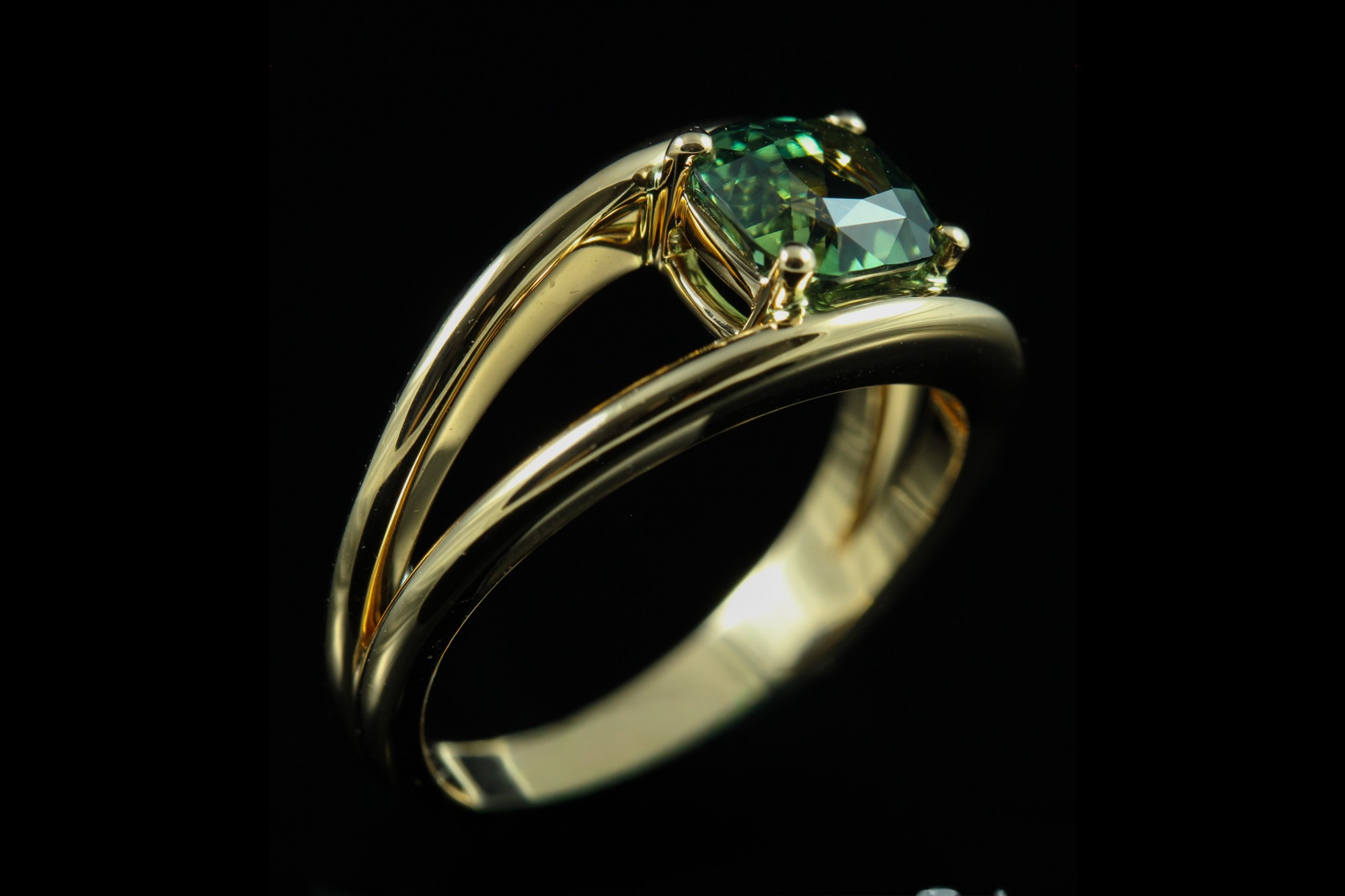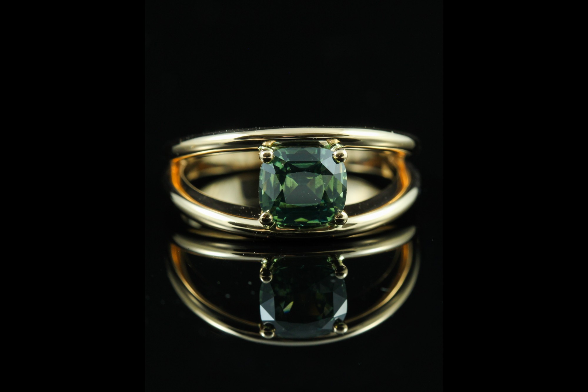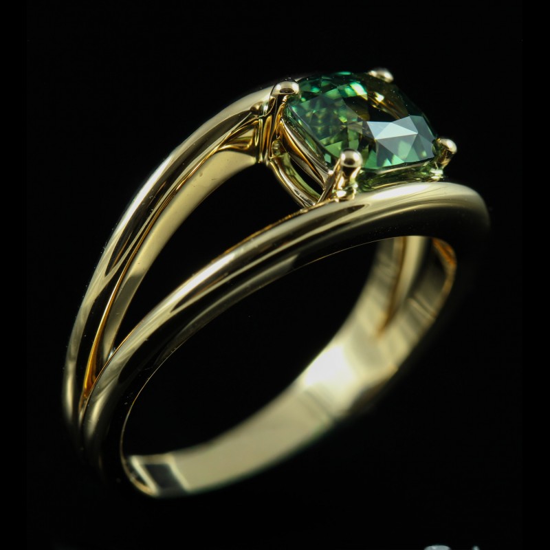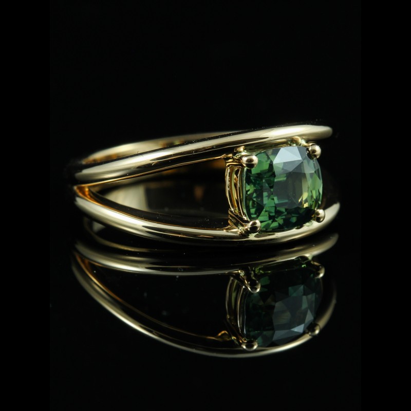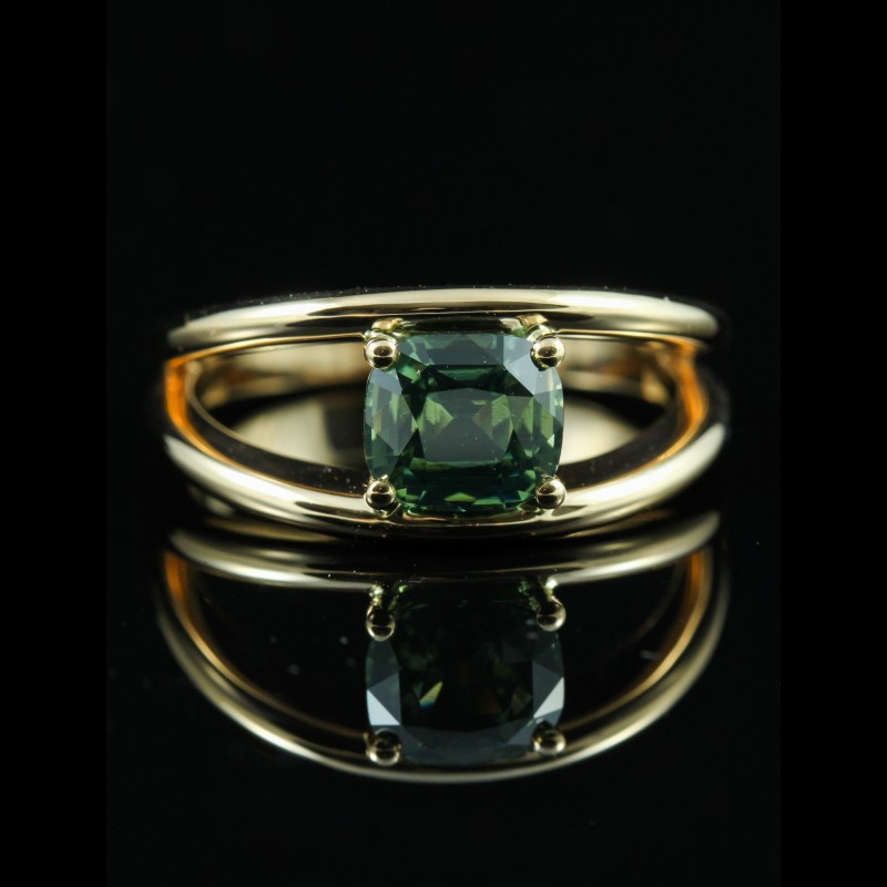 Cette bague en or rose met en valeur un saphir vert taille coussin de 1,53 carat, dévoilant des nuances profondes et lumineuses. Maintenue par de fines griffes, la pierre semble flotter au-dessus d’une monture délicatement travaillée, offrant légèreté et modernité à l’ensemble. Originale et élégante, cette création séduit par son caractère unique et son harmonie subtile entre la chaleur de l’or et l’intensité du vert, pour un bijou à la fois contemporain et intemporel.