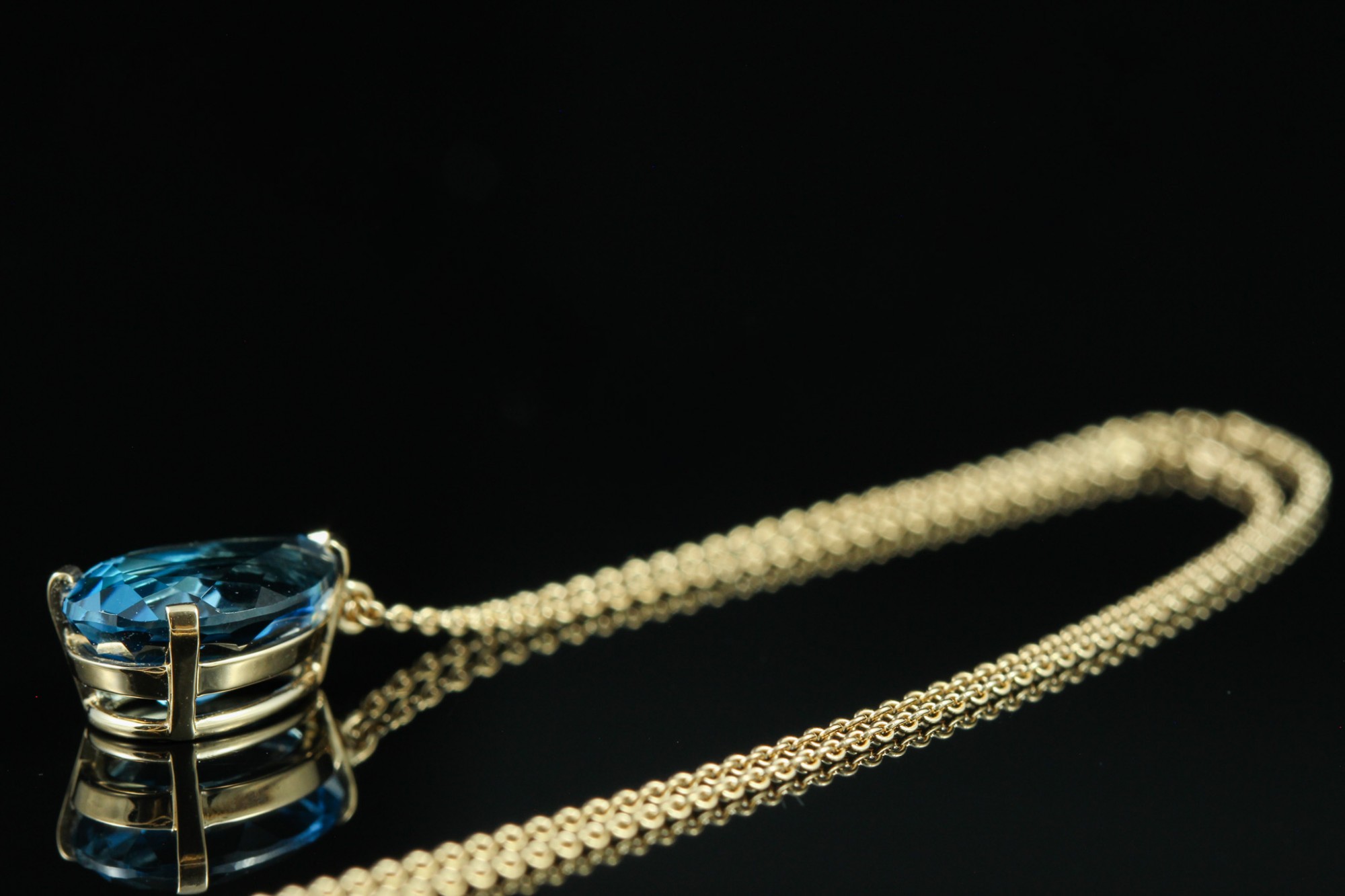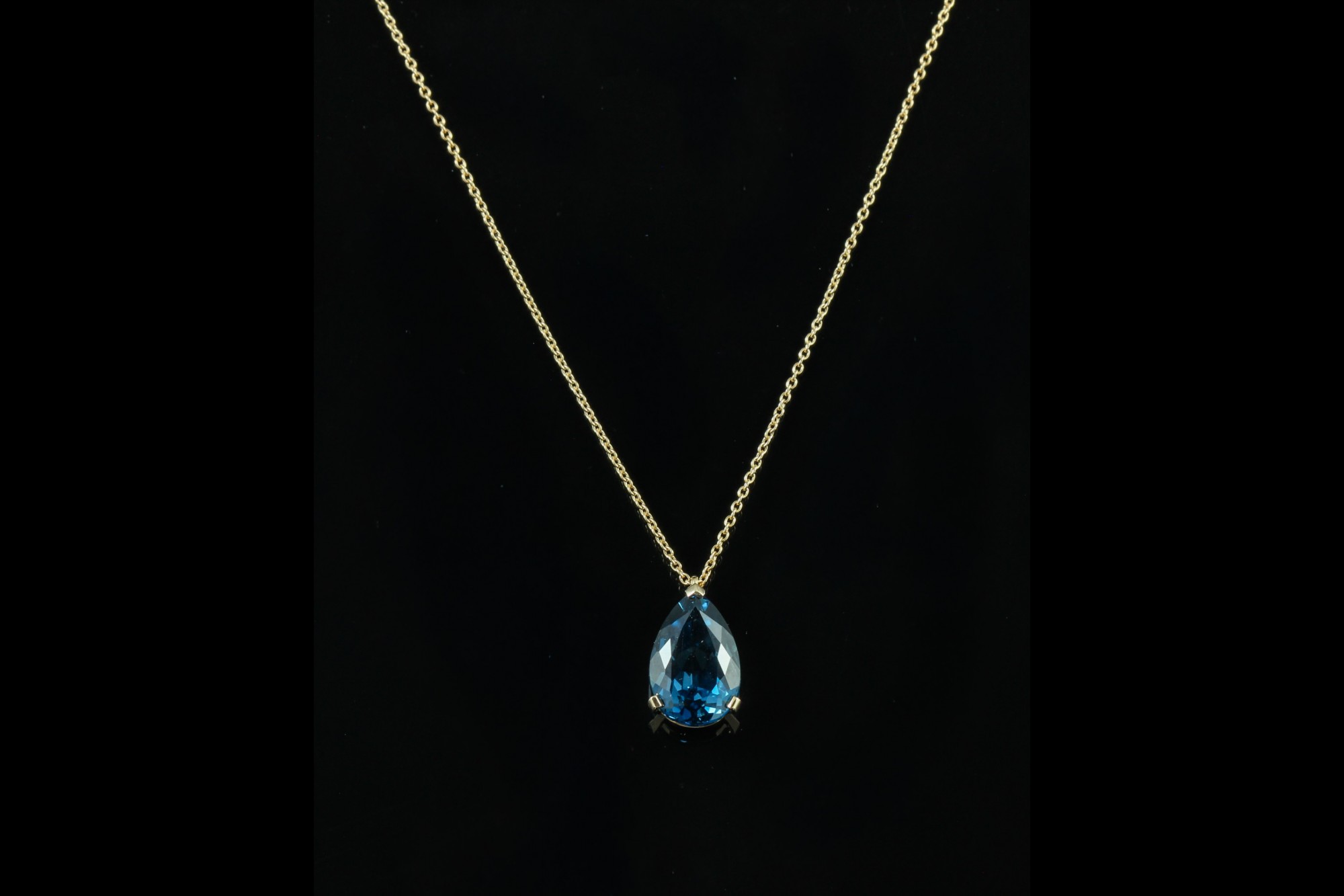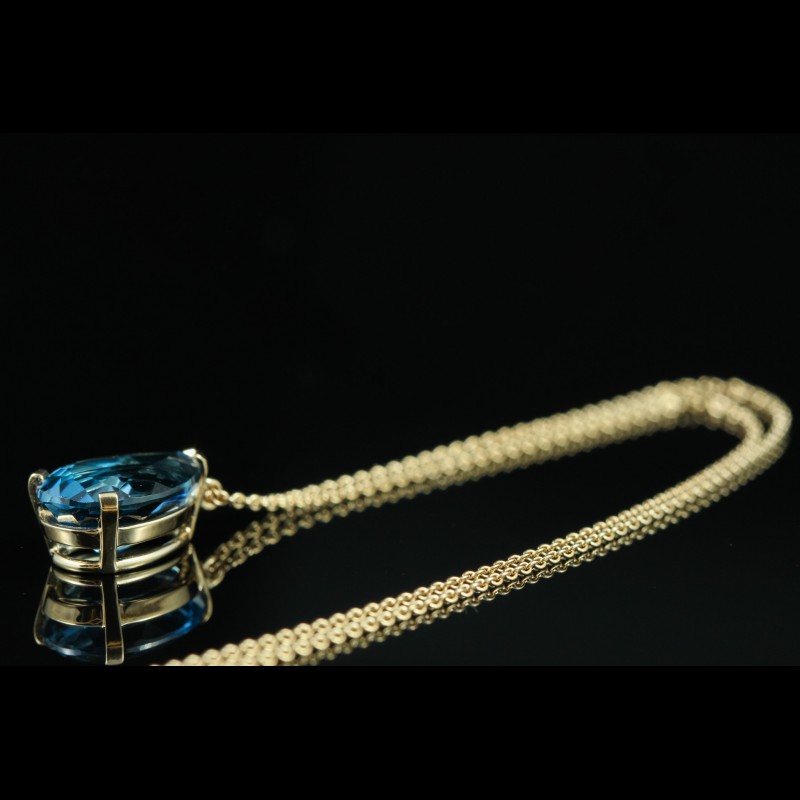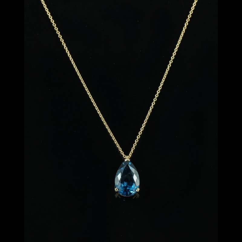 Ce pendentif en or rose met en lumière une topaze bleue London de 4,20 carats, taillée en forme de goutte. Sa teinte profonde, aux reflets intenses et légèrement mystérieux, capte la lumière avec élégance. Suspendue à une chaîne fine, la pierre est délicatement maintenue par des griffes discrètes qui soulignent sa pureté et sa brillance. Une création à la fois moderne et intemporelle, idéale pour apporter une touche de couleur sophistiquée à votre silhouette.