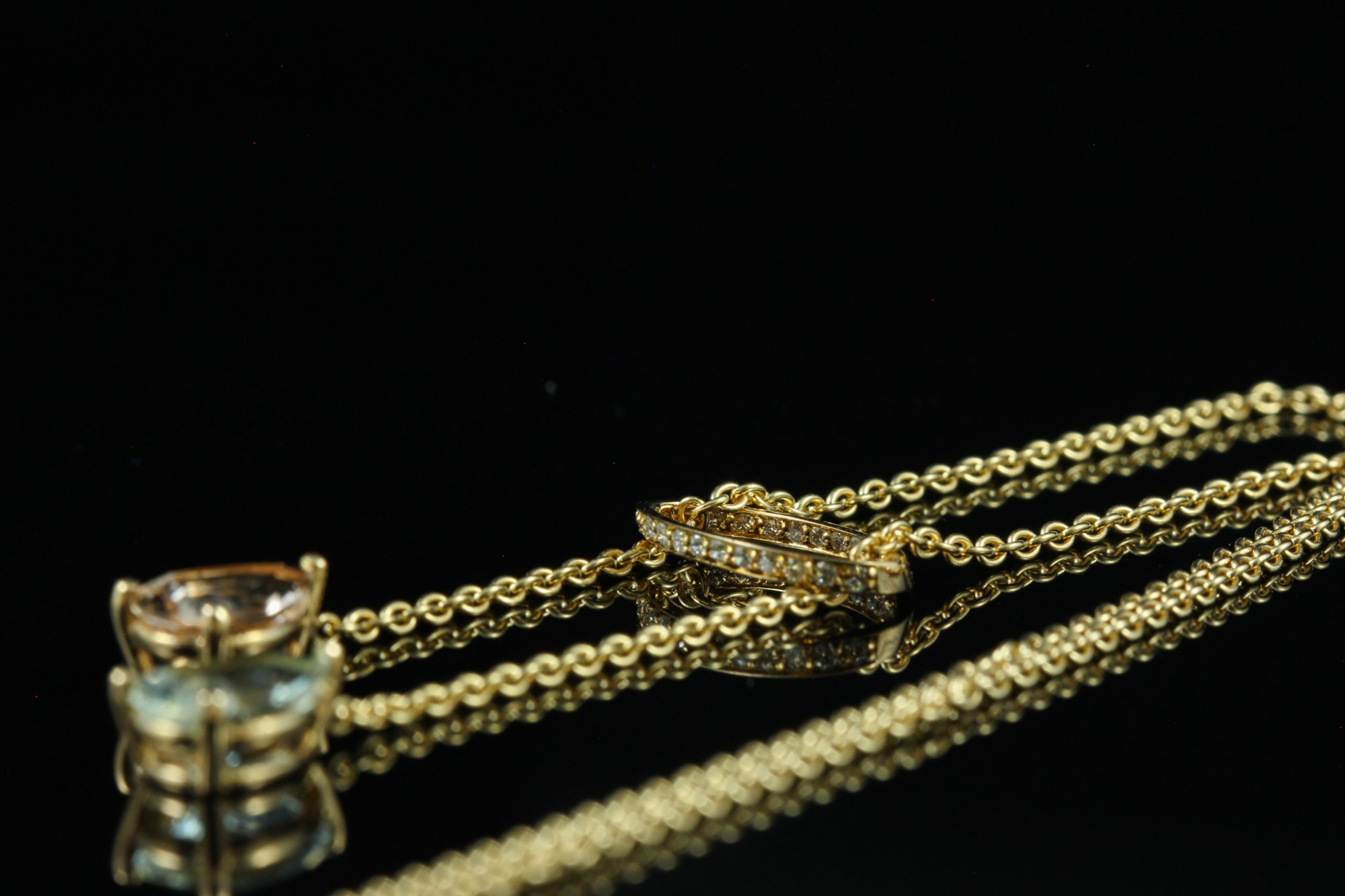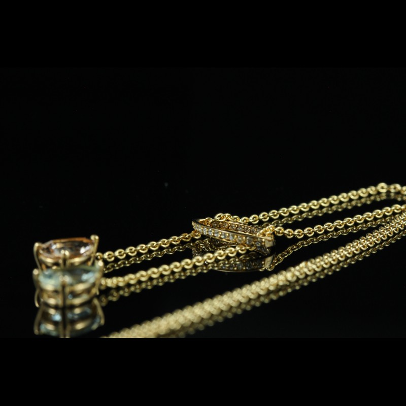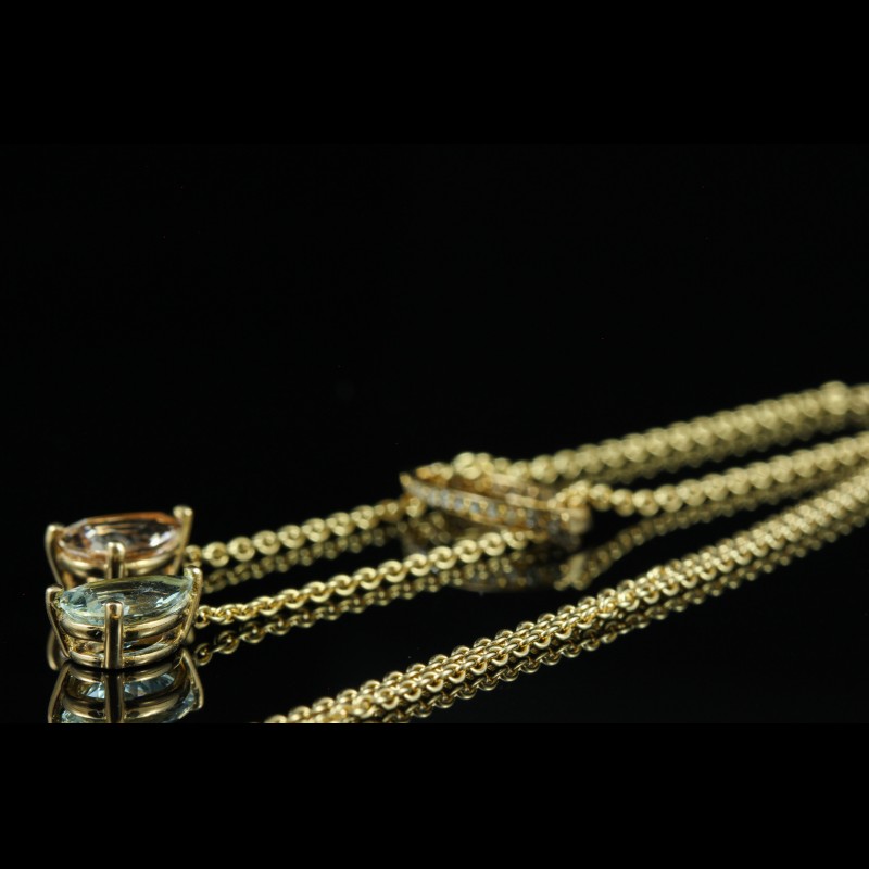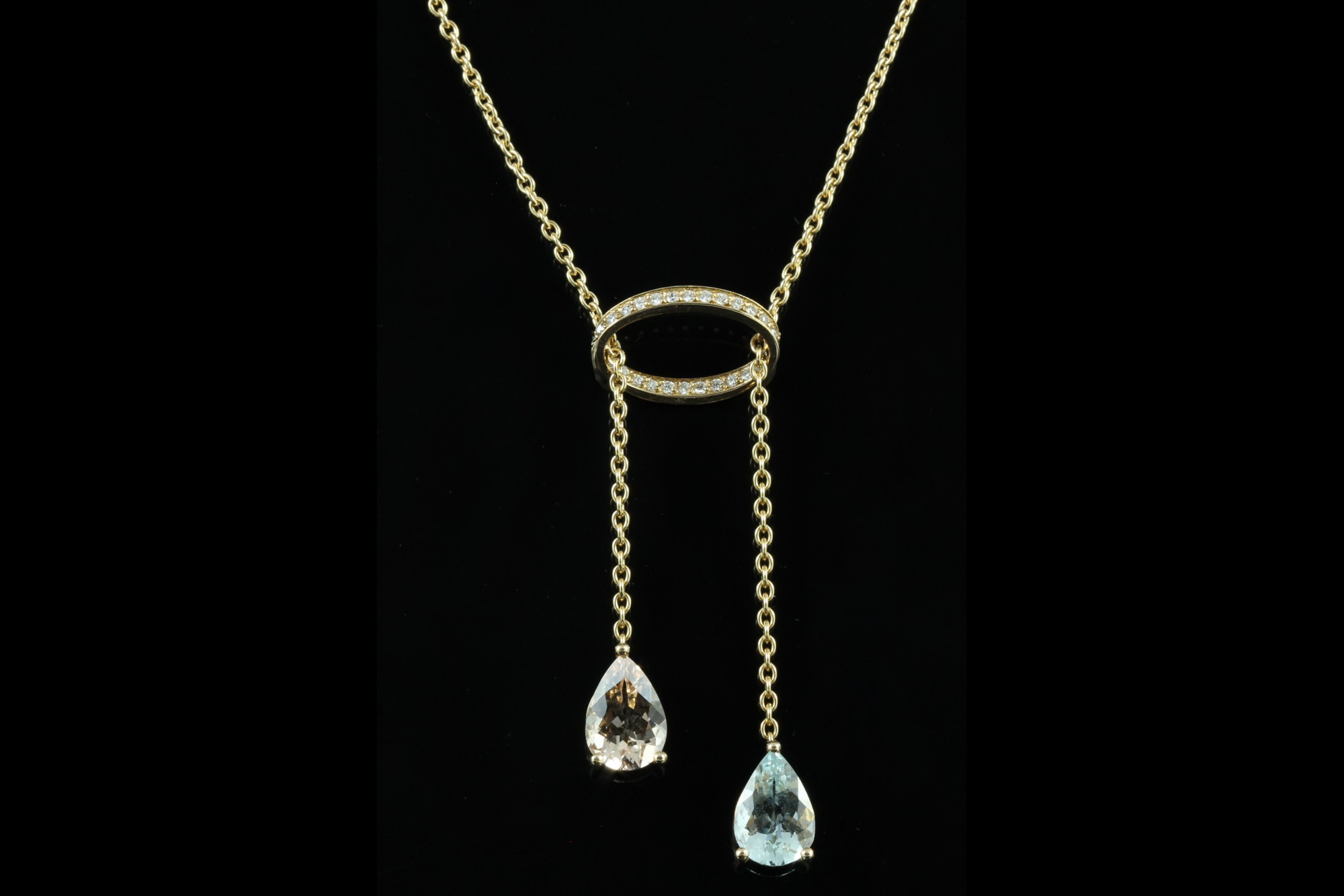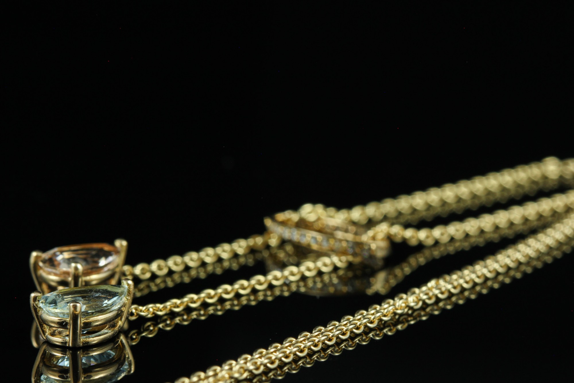 Ce pendentif négligé en or jaune se distingue par son élégante asymétrie et son jeu de mouvement délicat. Il met en scène une morganite aux nuances rosées et une aigue-marine aux reflets bleutés, toutes deux taillées en goutte et totalisant 2,74 carats. L’association de ces teintes douces crée une harmonie subtile et lumineuse, tandis que la double chute apporte une touche contemporaine et raffinée. Un bijou féminin et aérien, idéal pour sublimer le port de tête avec légèreté.
