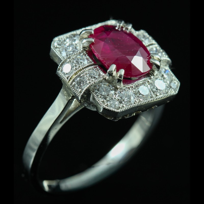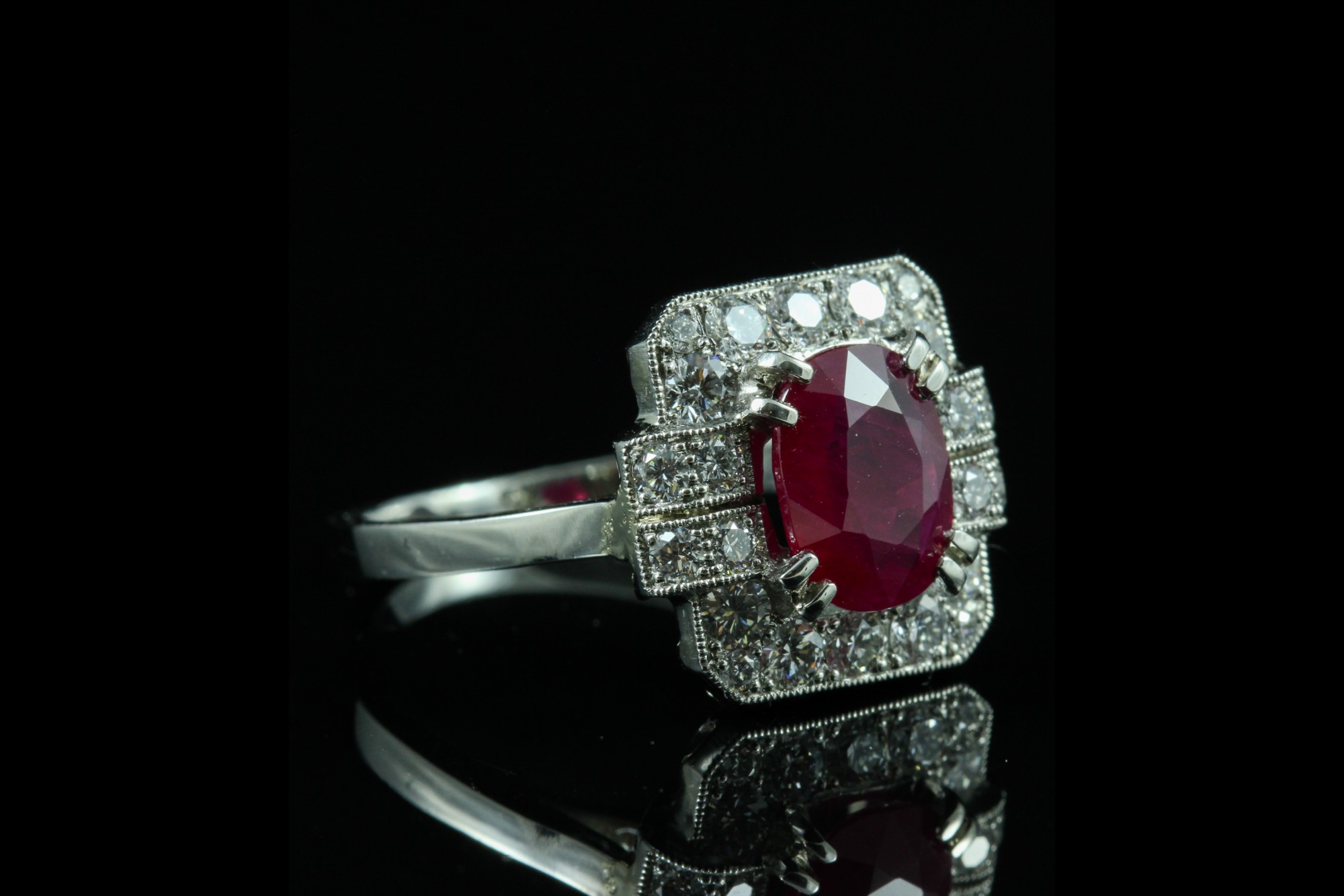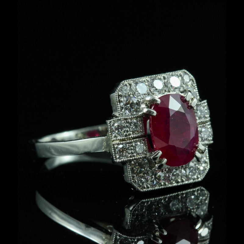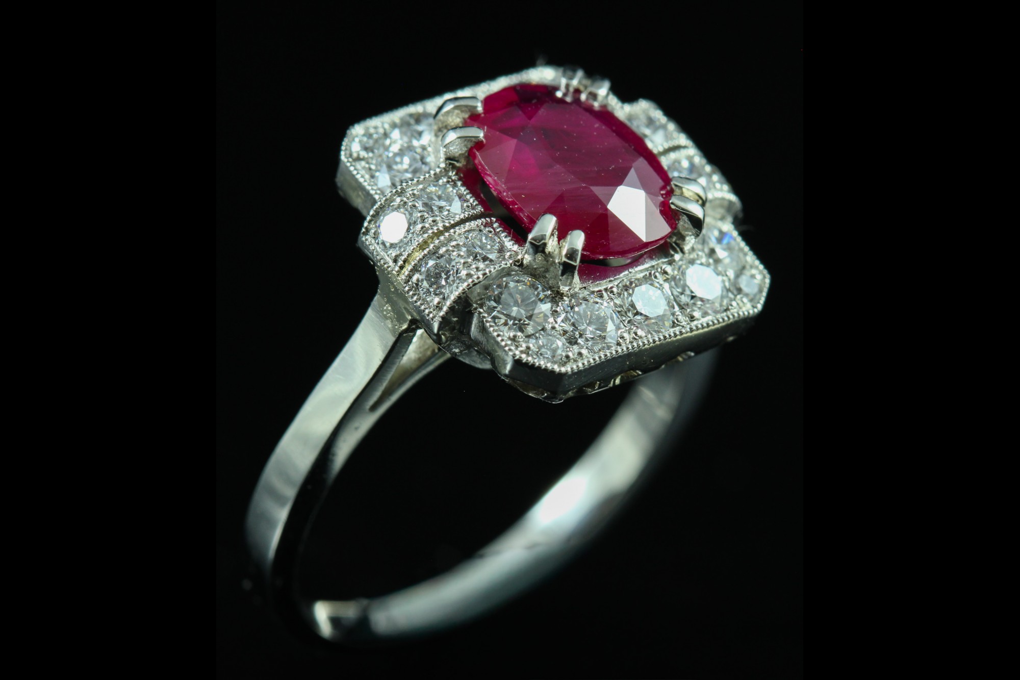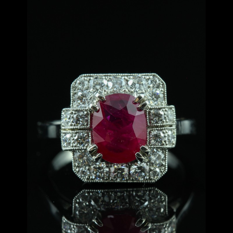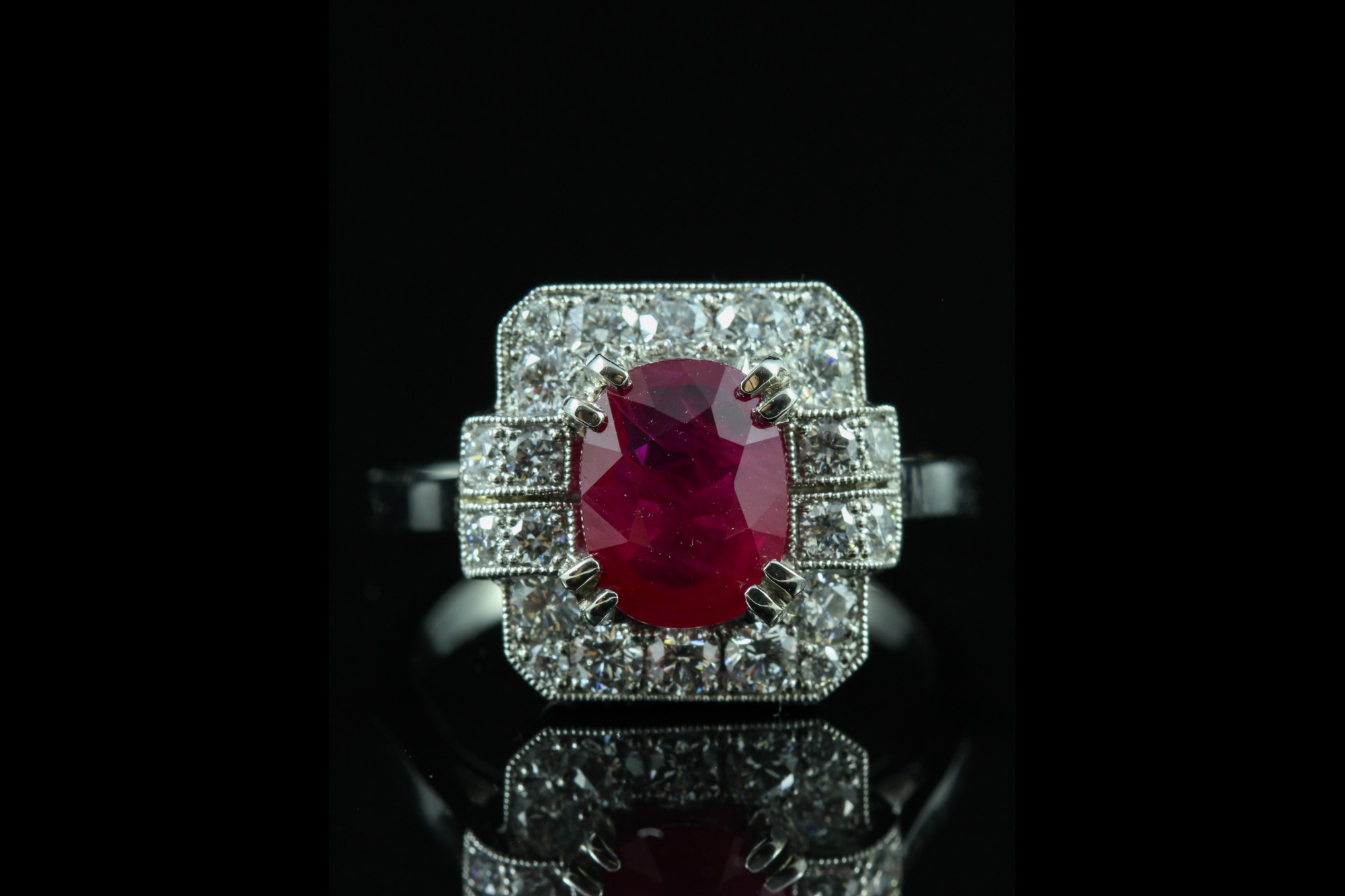 Cette bague en platine met à l’honneur un rubis de 2,18 carats, à la couleur rouge profonde et envoûtante, véritable symbole de passion et d’élégance. Taillé avec soin et maintenu par de fines griffes, il révèle toute l’intensité de ses reflets. Il est sublimé par un entourage de diamants totalisant 0,87 carat, dont l’éclat vient magnifier la pierre centrale et structurer délicatement l’ensemble. À la fois raffinée et intemporelle, cette création séduit par son équilibre parfait entre caractère et sophistication.
