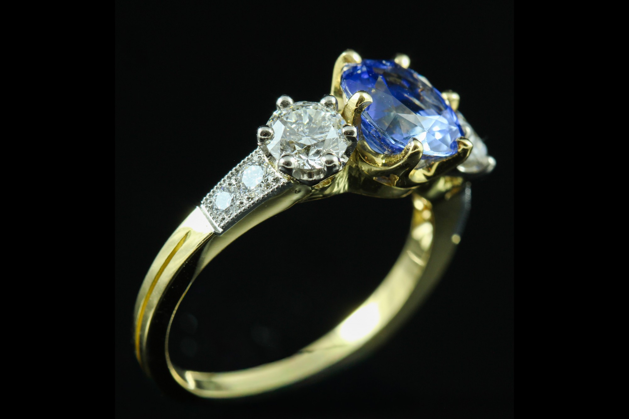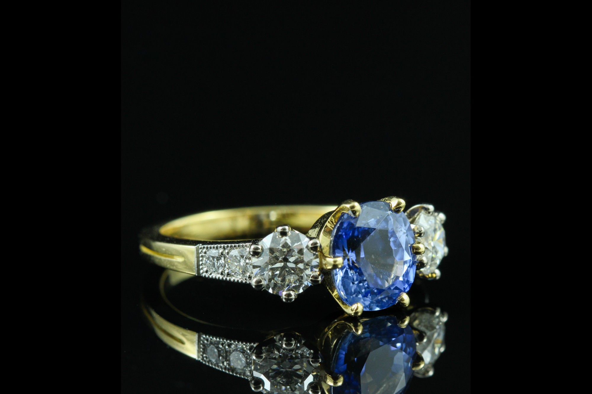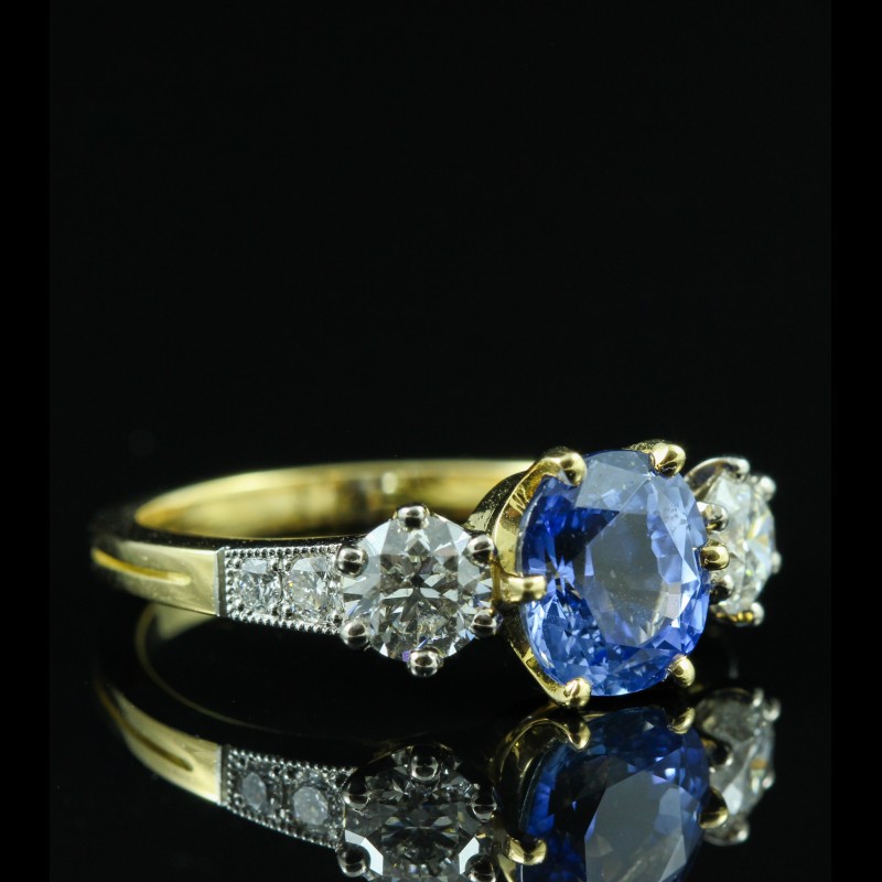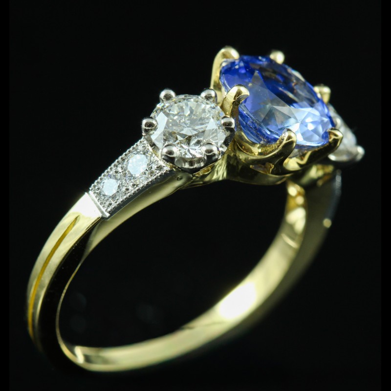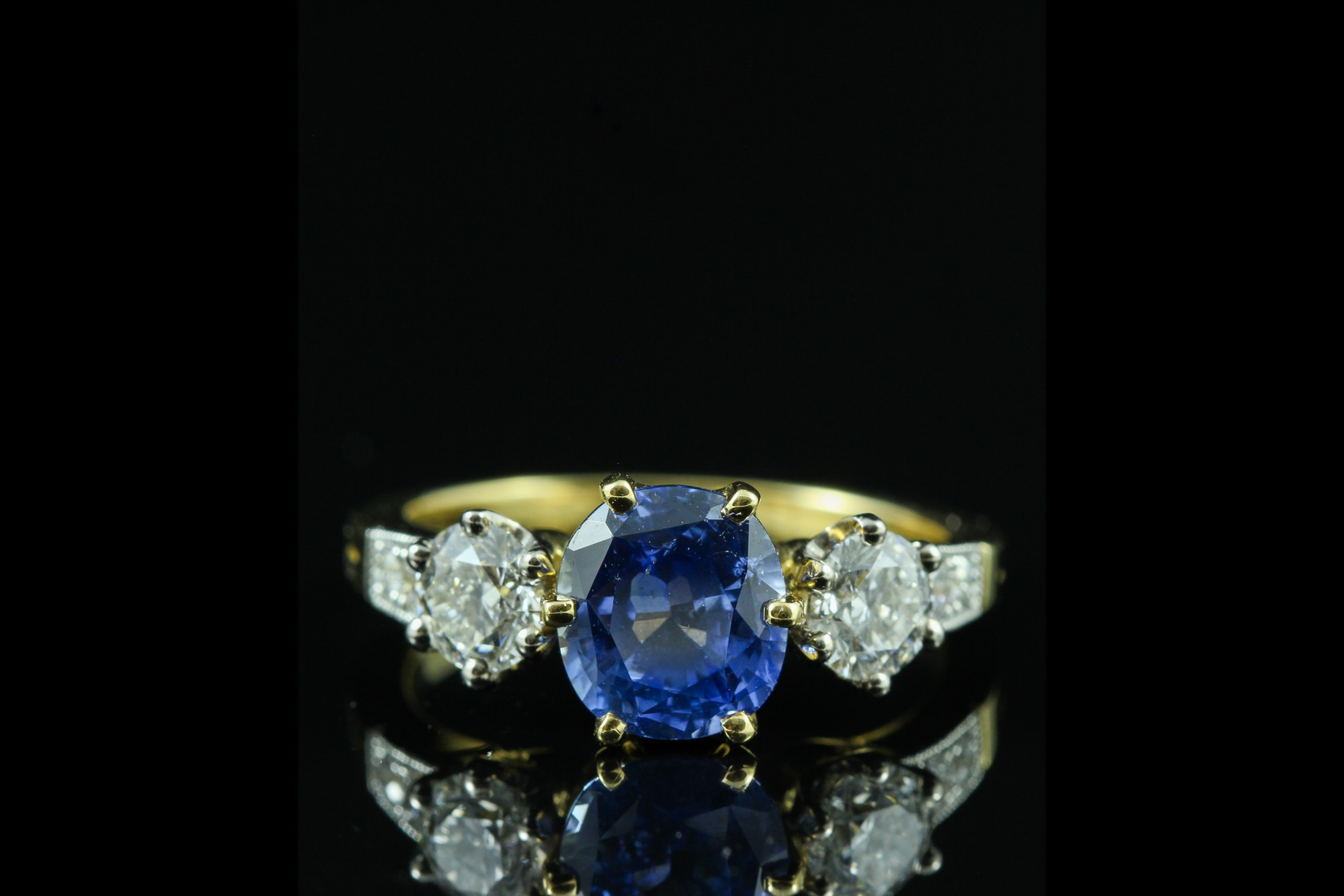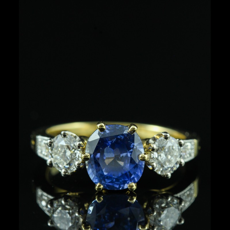 Cette bague en or jaune met en valeur un saphir de 2,77 carats, à la teinte bleue intense et lumineuse, sublimé par une monture élégante aux lignes équilibrées. Il est accompagné de deux diamants sur l’entourage totalisant 1,03 carat, apportant éclat et contraste à la pierre centrale. Des diamants supplémentaires, totalisant 0,17 carat, viennent délicatement orner la monture et renforcer la brillance de l’ensemble. À la fois classique et raffinée, cette création incarne une élégance intemporelle, idéale pour sublimer la main avec distinction.