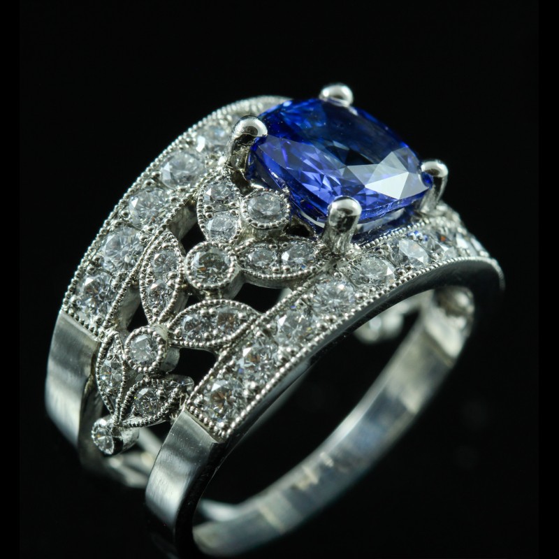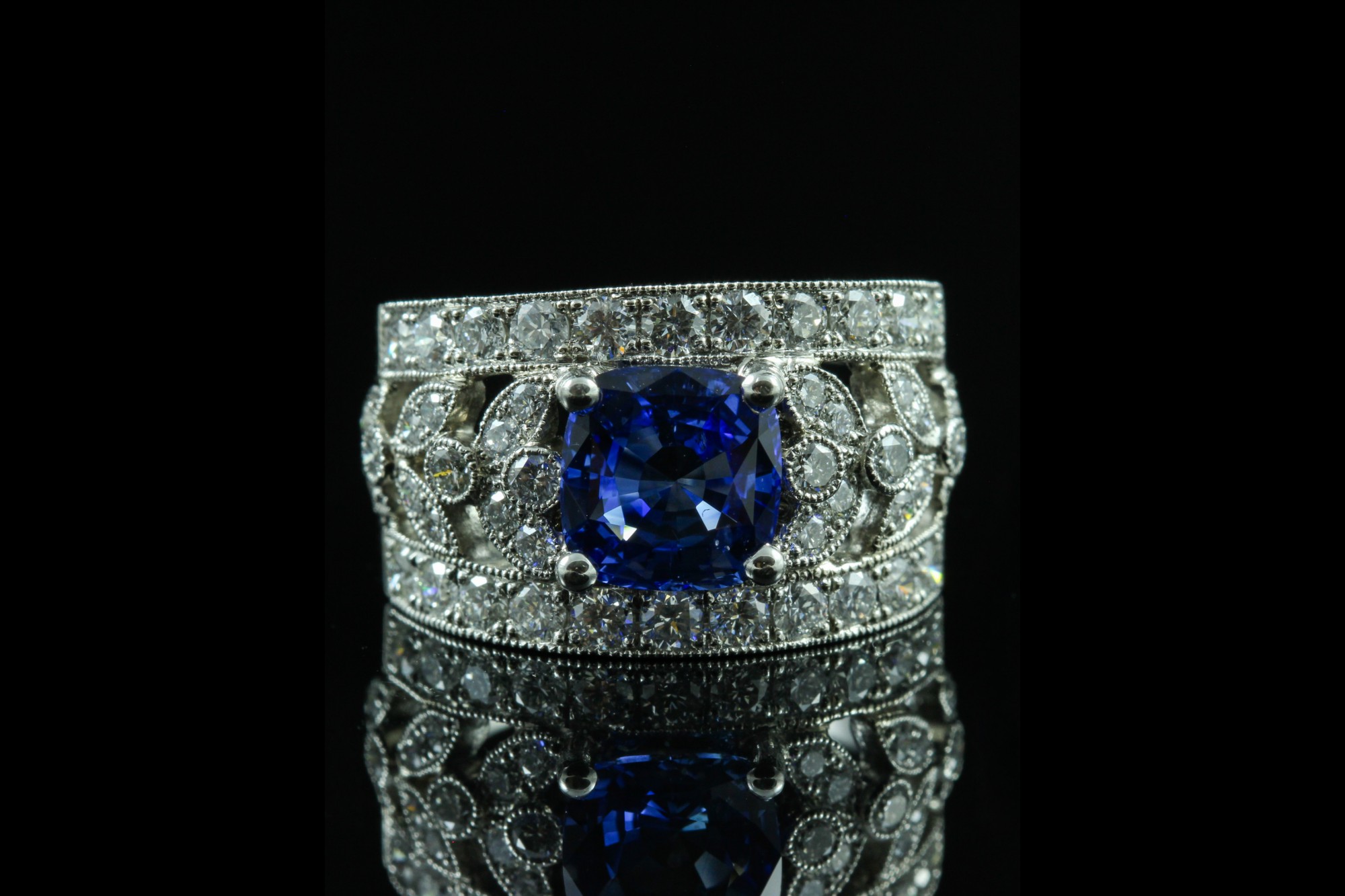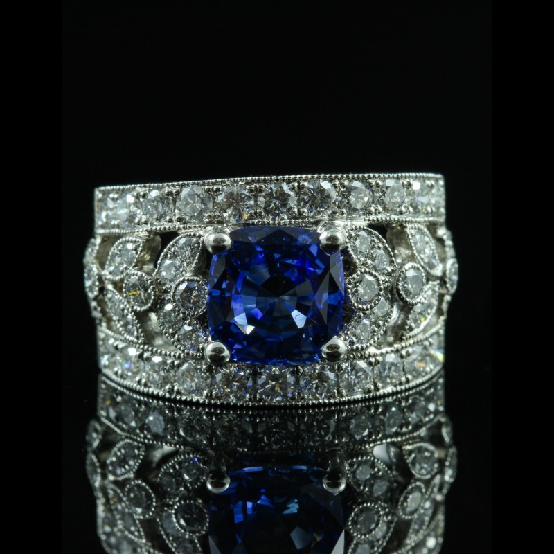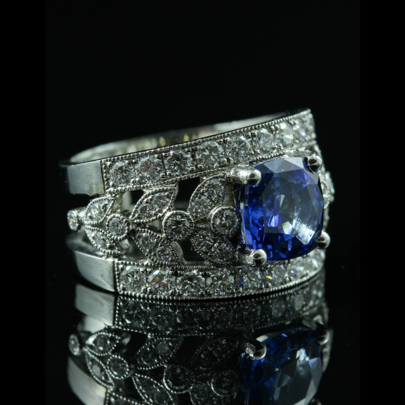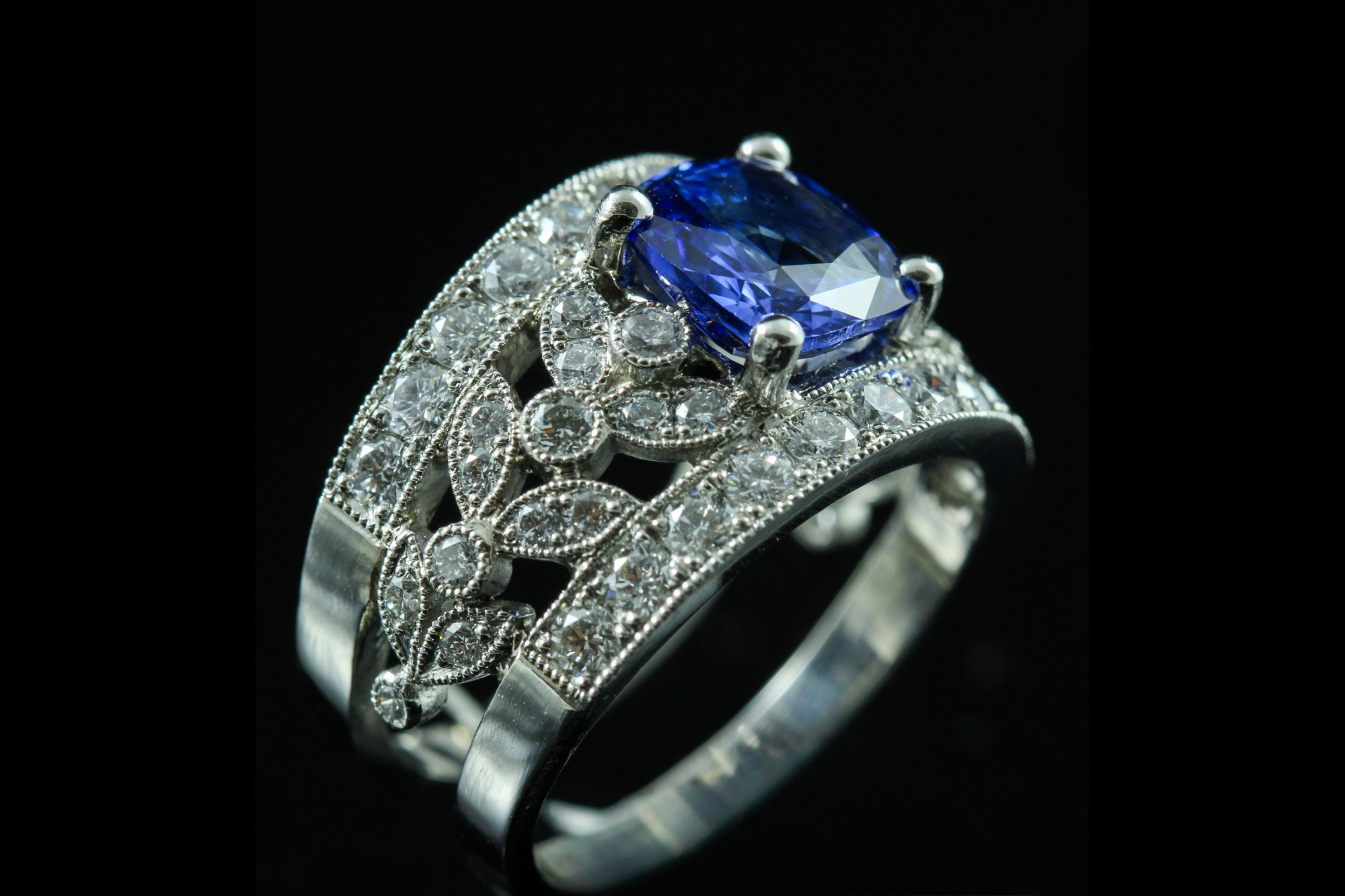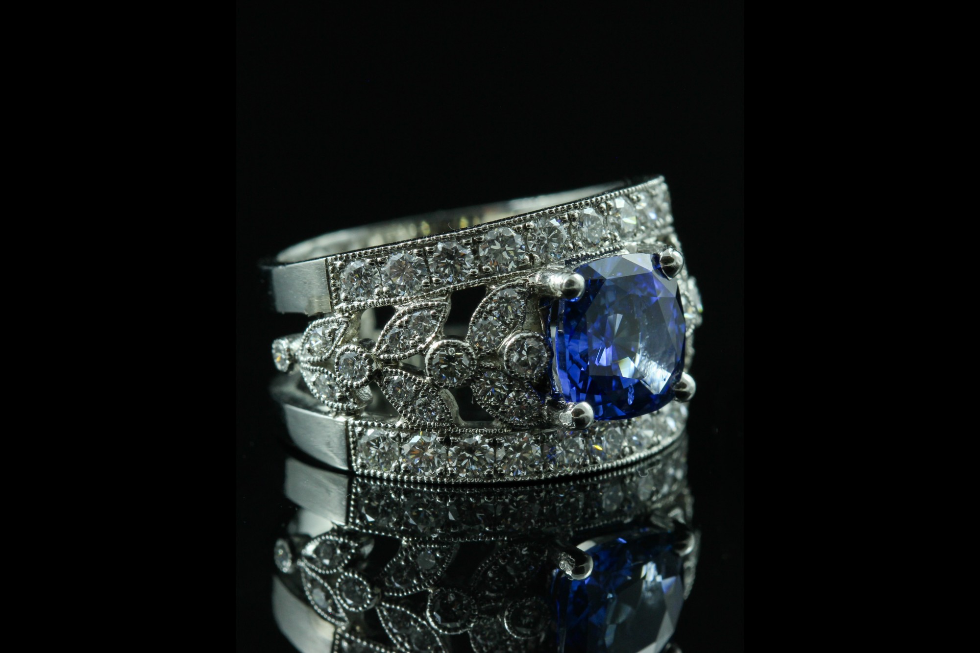 Cette bague en platine met en valeur un saphir de 2,52 carats, à la teinte bleue profonde et lumineuse, délicatement maintenu par des griffes qui laissent pleinement s’exprimer son éclat. L’entourage, finement travaillé dans un esprit presque dentelle, est sublimé par des diamants totalisant 1,38 carat. Ce pavage minutieux crée un jeu de lumière raffiné et souligne avec élégance la pierre centrale. À la fois sophistiquée et délicate, cette création séduit par son travail ajouré et son allure précieuse, idéale pour celles et ceux en quête d’un bijou à fort caractère tout en finesse.