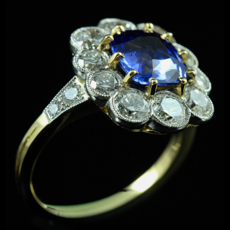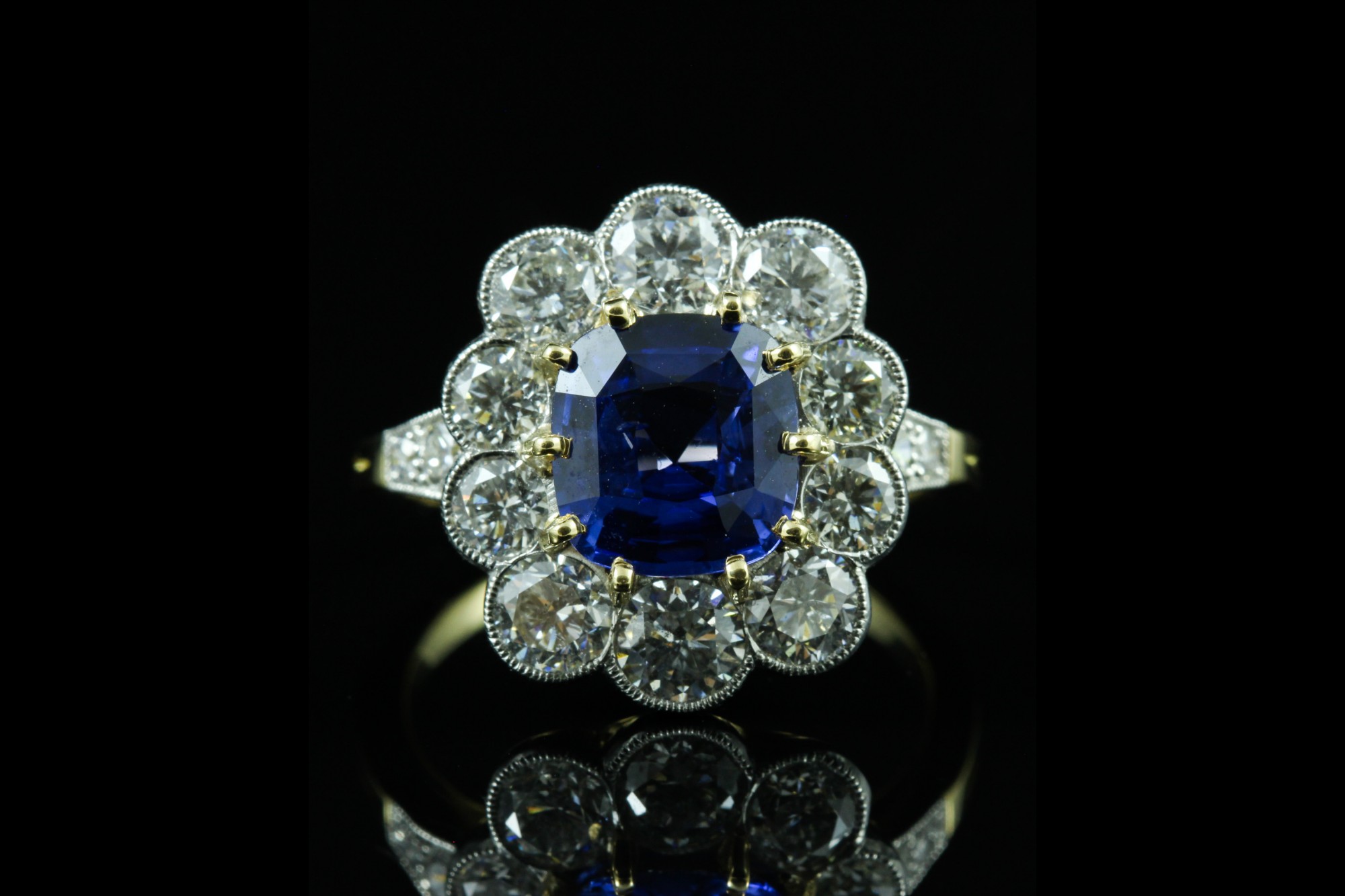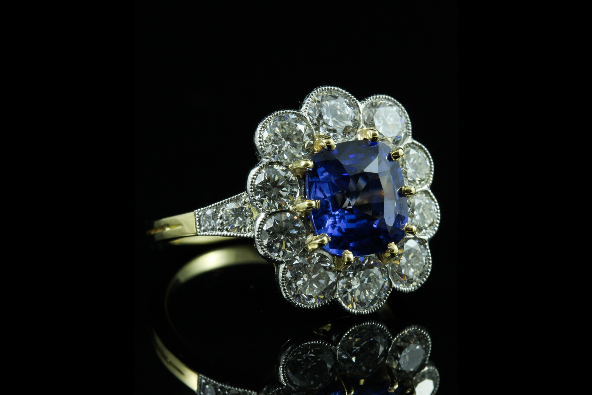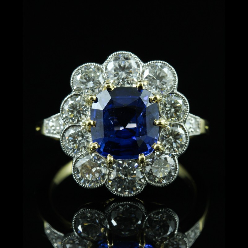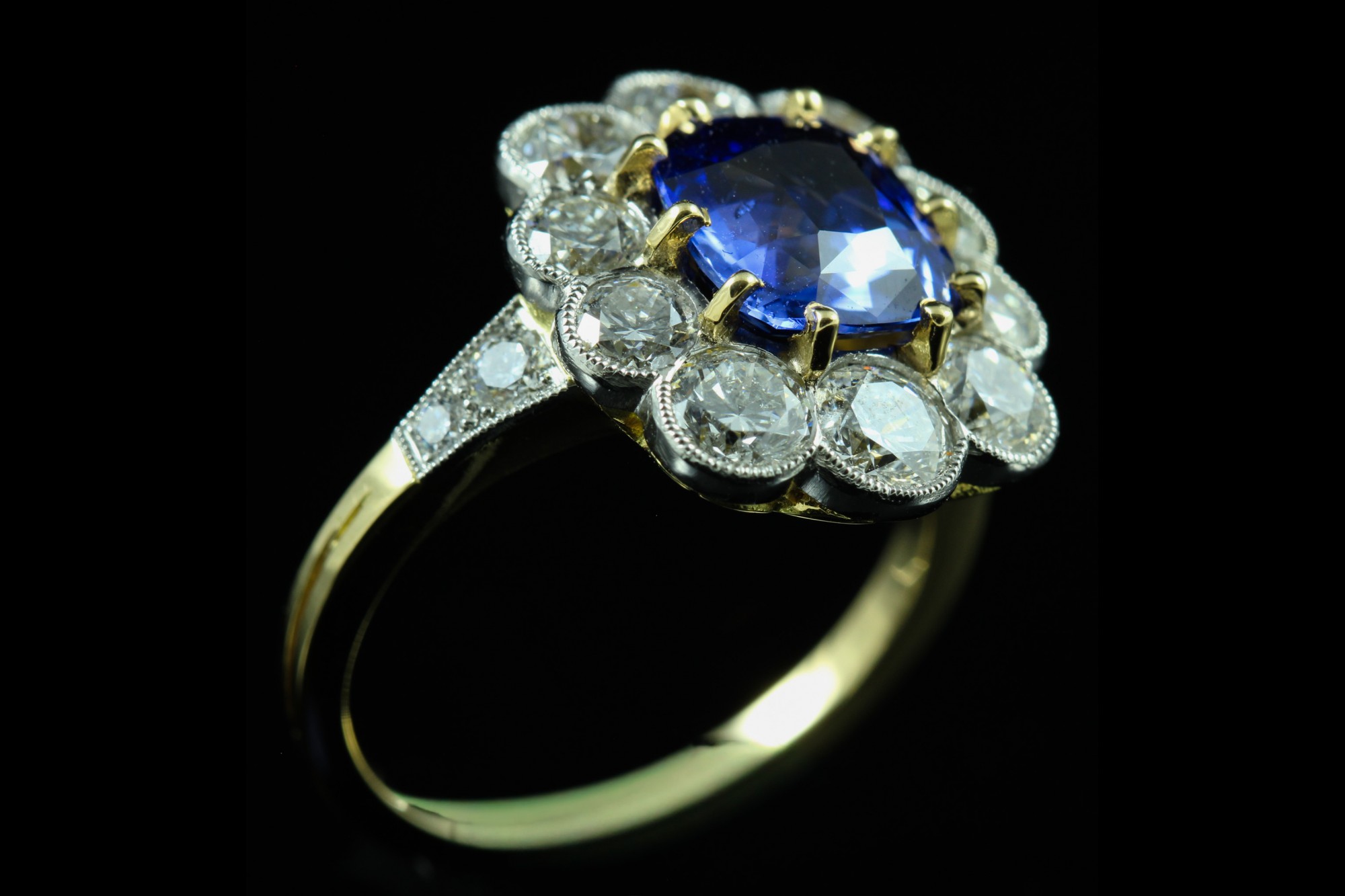 Cette bague en or jaune et platine met en lumière un saphir de 3,09 carats, à la couleur bleue profonde et veloutée. Maintenu par des griffes en or jaune, il révèle toute sa richesse et son éclat naturel. Il est entouré de diamants totalisant 2,70 carats, aux proportions généreuses, qui créent un halo lumineux et apportent une présence remarquable à la pièce. L’ensemble, à la fois élégant et affirmé, évoque le charme des bijoux anciens tout en conservant une allure intemporelle. Une création précieuse, idéale pour celles et ceux en quête d’un bijou d’exception.