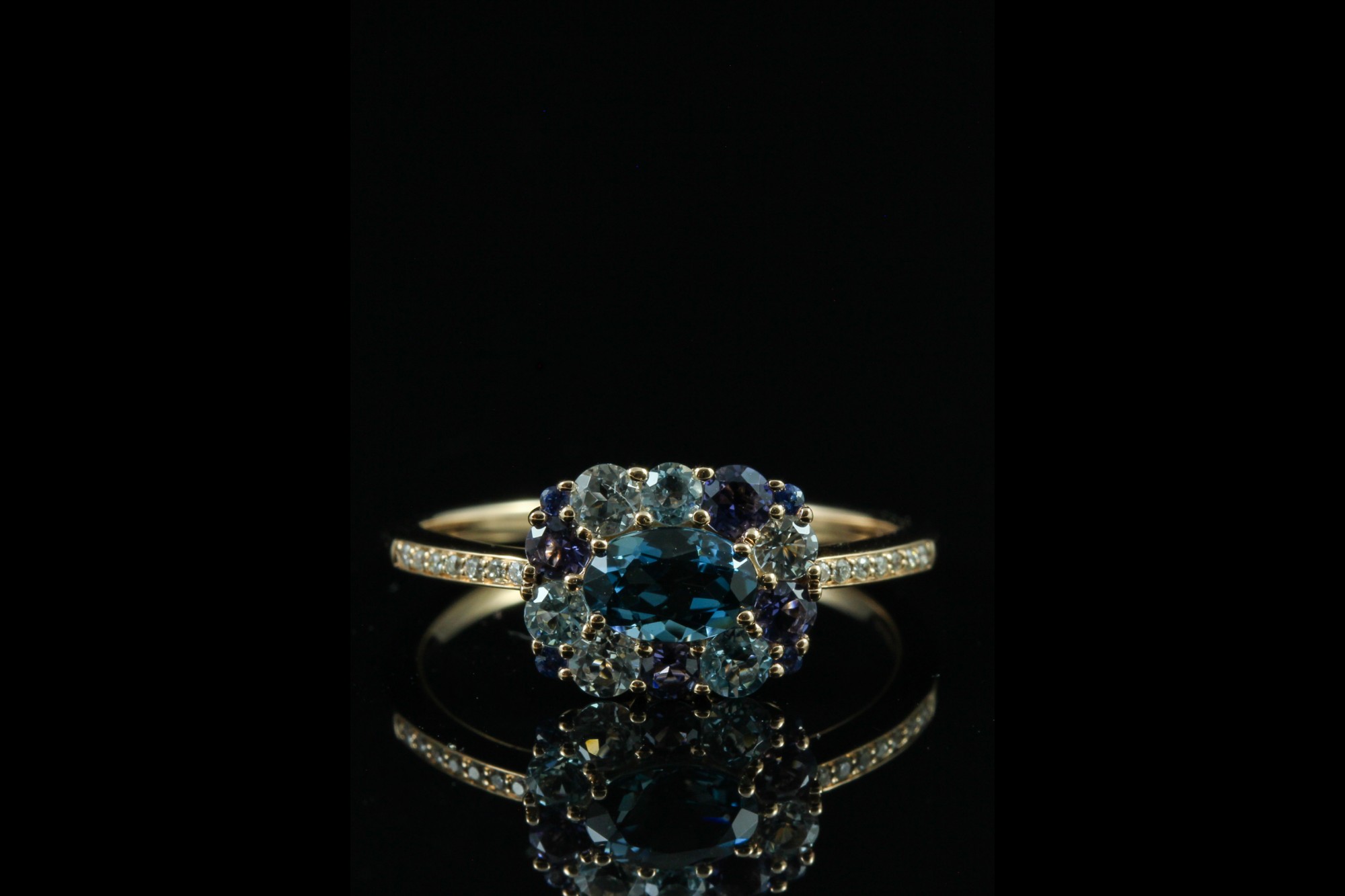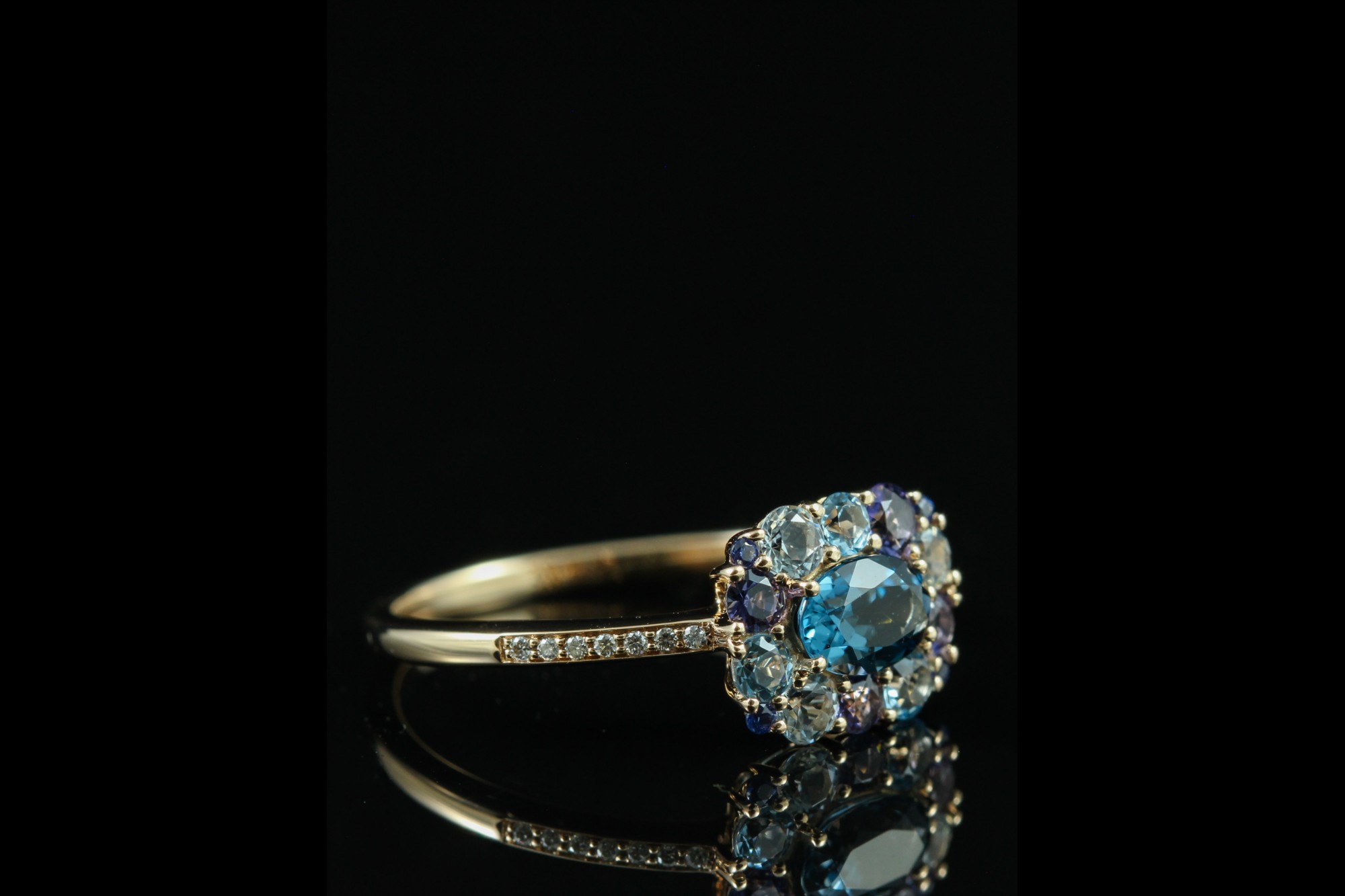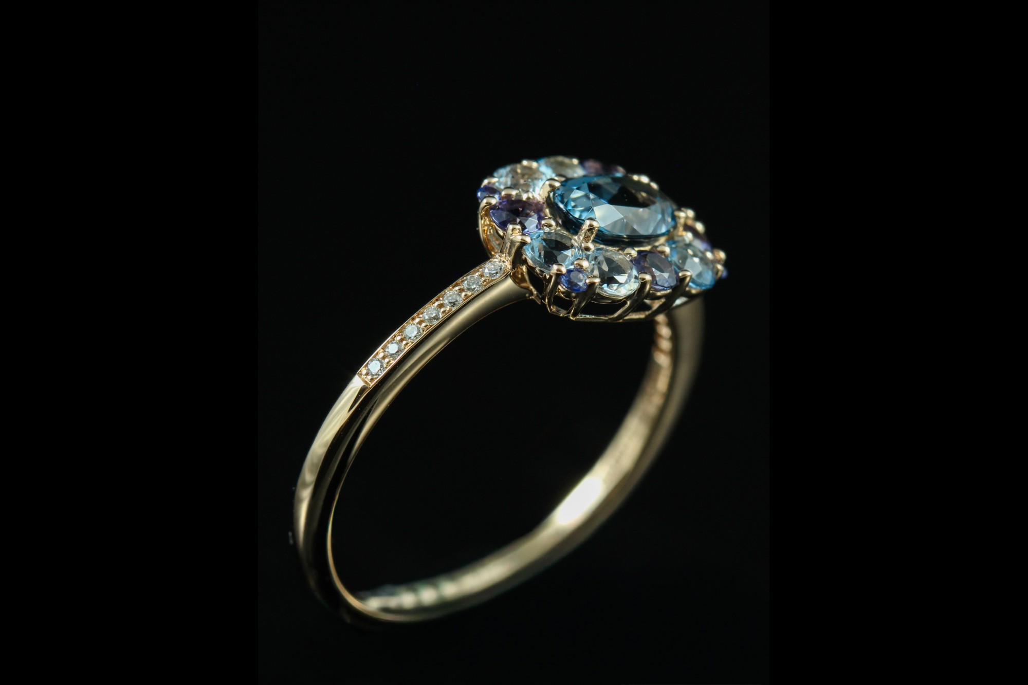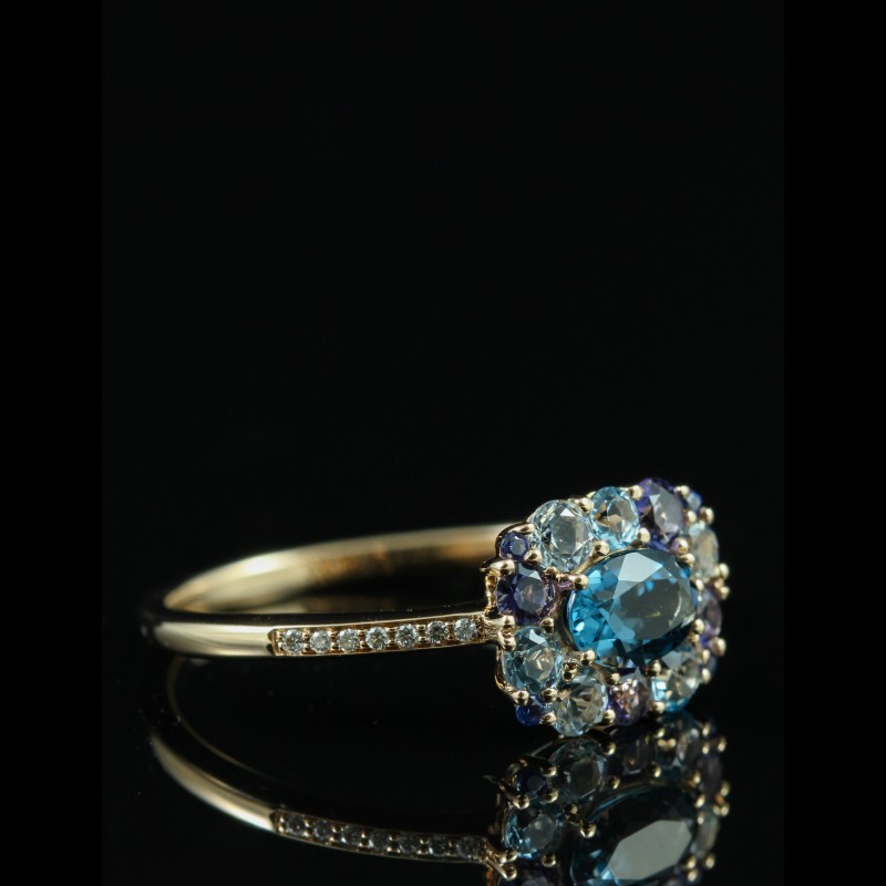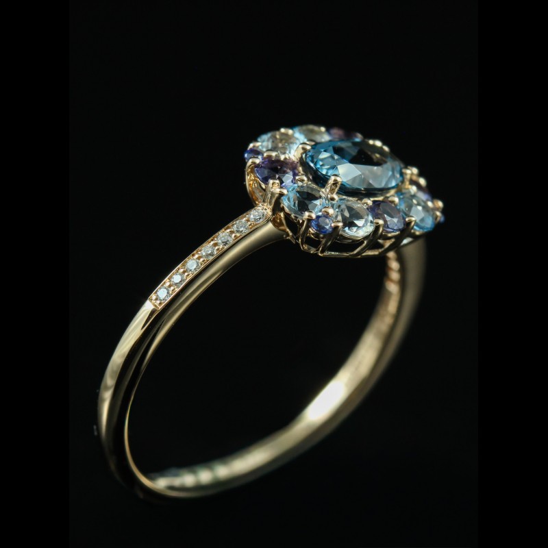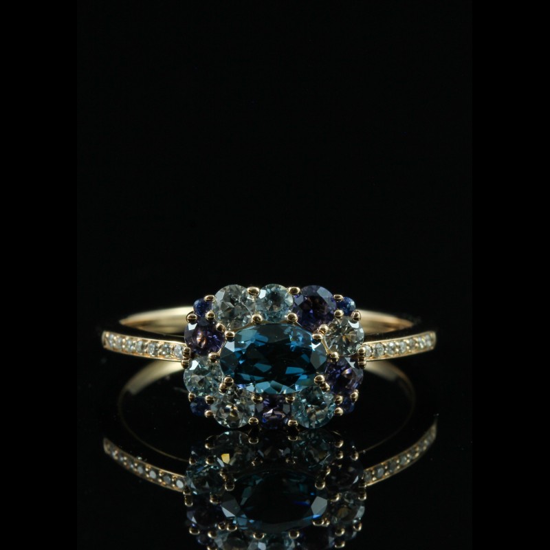 Cette bague en or rose signée Isabelle Langlois séduit par son harmonie de couleurs délicates et lumineuses. Elle met en scène un camaïeu de pierres fines, composé de topazes bleues aux trois nuances, d’iolites et de saphirs, subtilement associés pour créer un dégradé raffiné. L’ensemble est délicatement rehaussé de diamants, apportant éclat et légèreté à la composition. Inspirée d’un univers floral et poétique, cette création incarne une élégance douce et contemporaine, idéale pour illuminer la main avec fraîcheur et originalité.