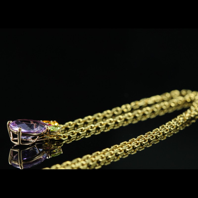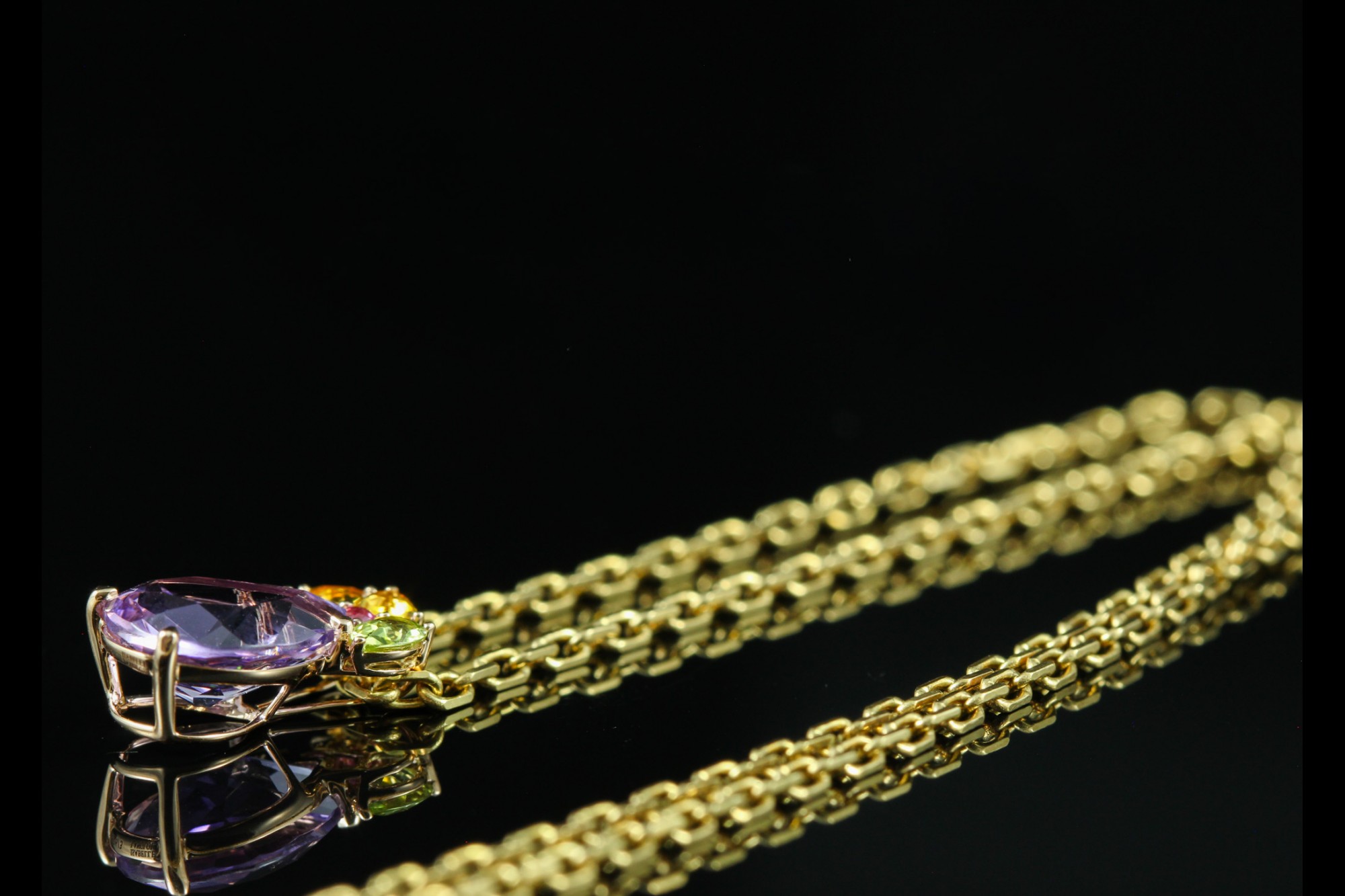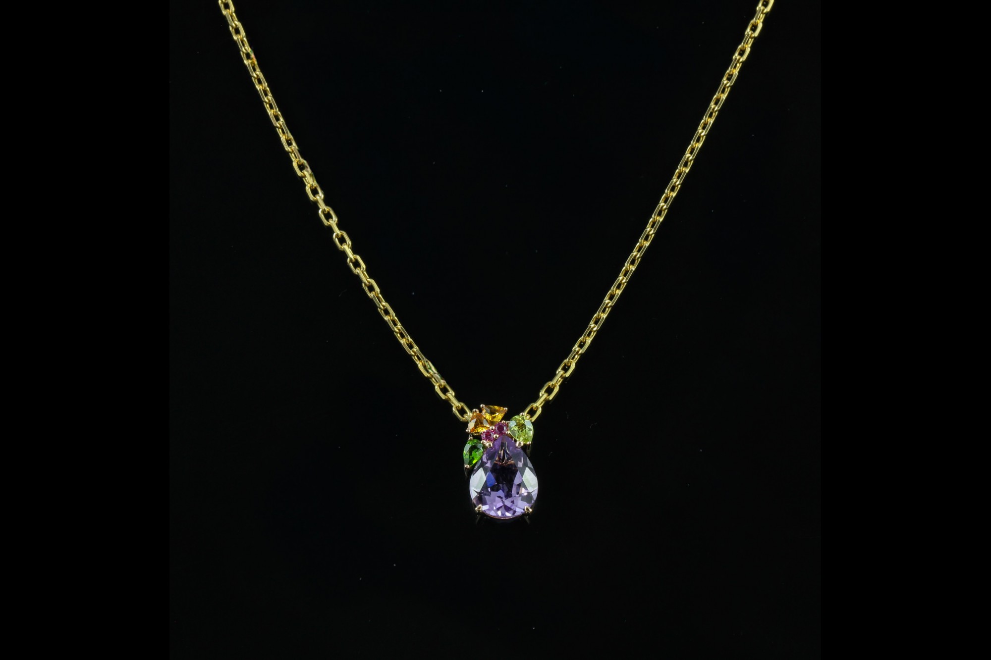 Ce pendentif en or rose signé Isabelle Langlois séduit par son harmonie de couleurs lumineuses et délicates. Il associe un saphir rose, un péridot, un diopside et une citrine, pour un total de 1,99 carat, composant un dégradé subtil et raffiné. La pierre principale, taillée en goutte, est délicatement mise en valeur par cet ensemble de teintes fraîches et vibrantes, apportant éclat et modernité à la pièce. À la fois élégant et plein de légèreté, ce pendentif incarne une joaillerie contemporaine et poétique, idéale pour illuminer le quotidien avec une touche de couleur.