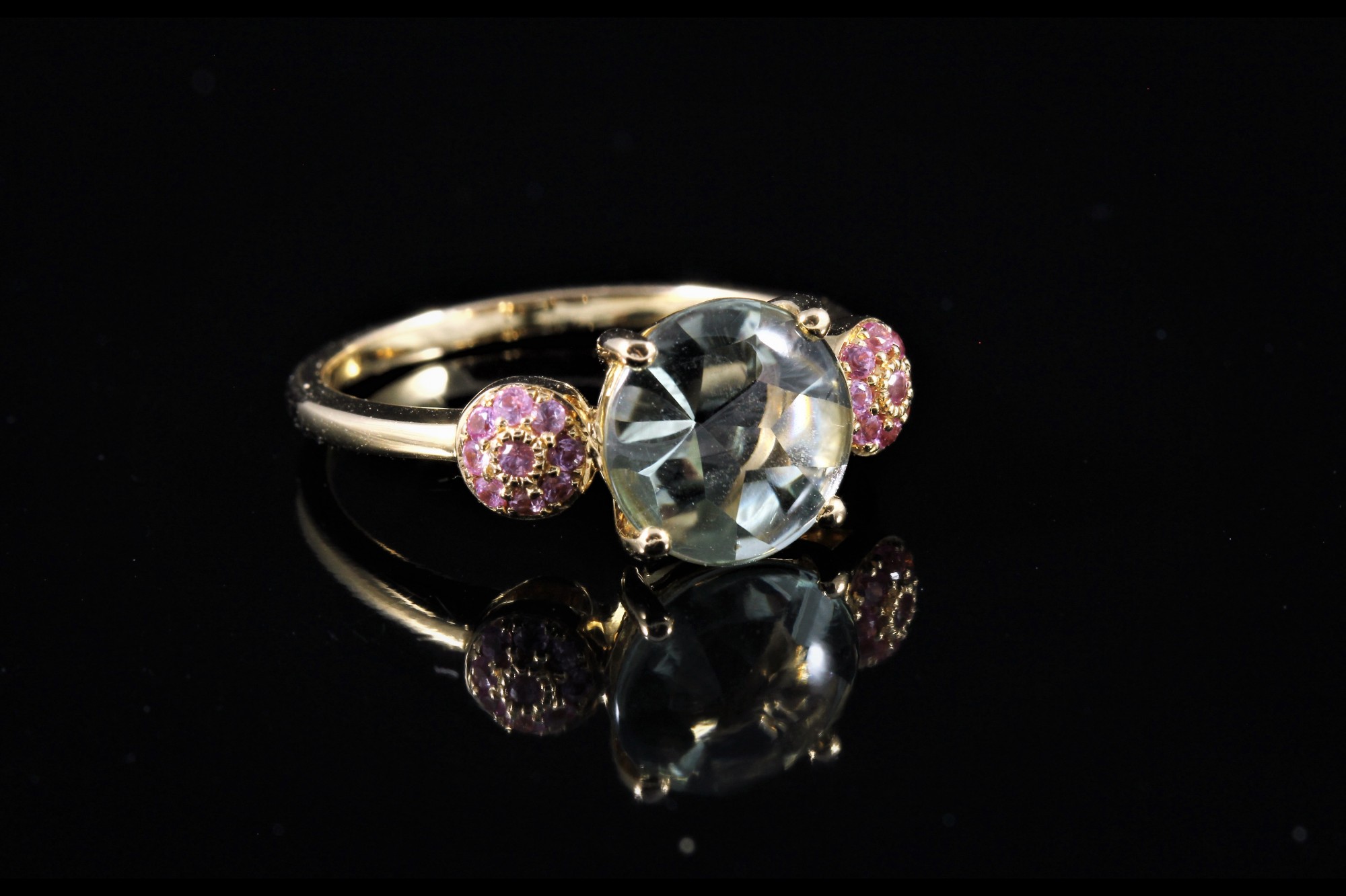 Bague or rose ornée d'un quartz vert entouré de saphirs roses